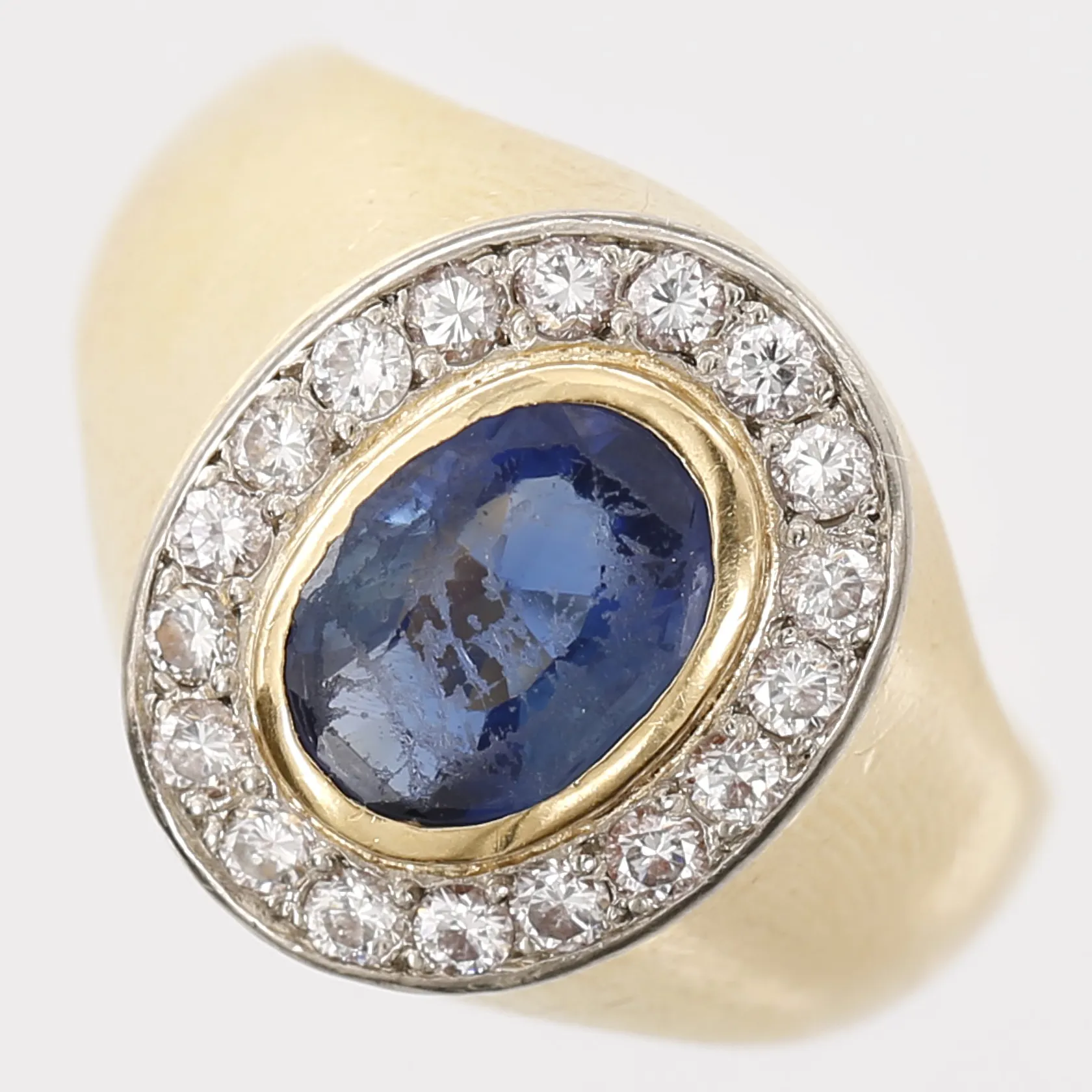 Ring med syntetisk safir och diamanter, 17 x ca 0,02ct, kraftigt slitage på safir, stl: 17, tillverkad av Lars-Ola Sellén Guldsmed, Gnesta1984, 18K guld Vikt: 12,1 g.