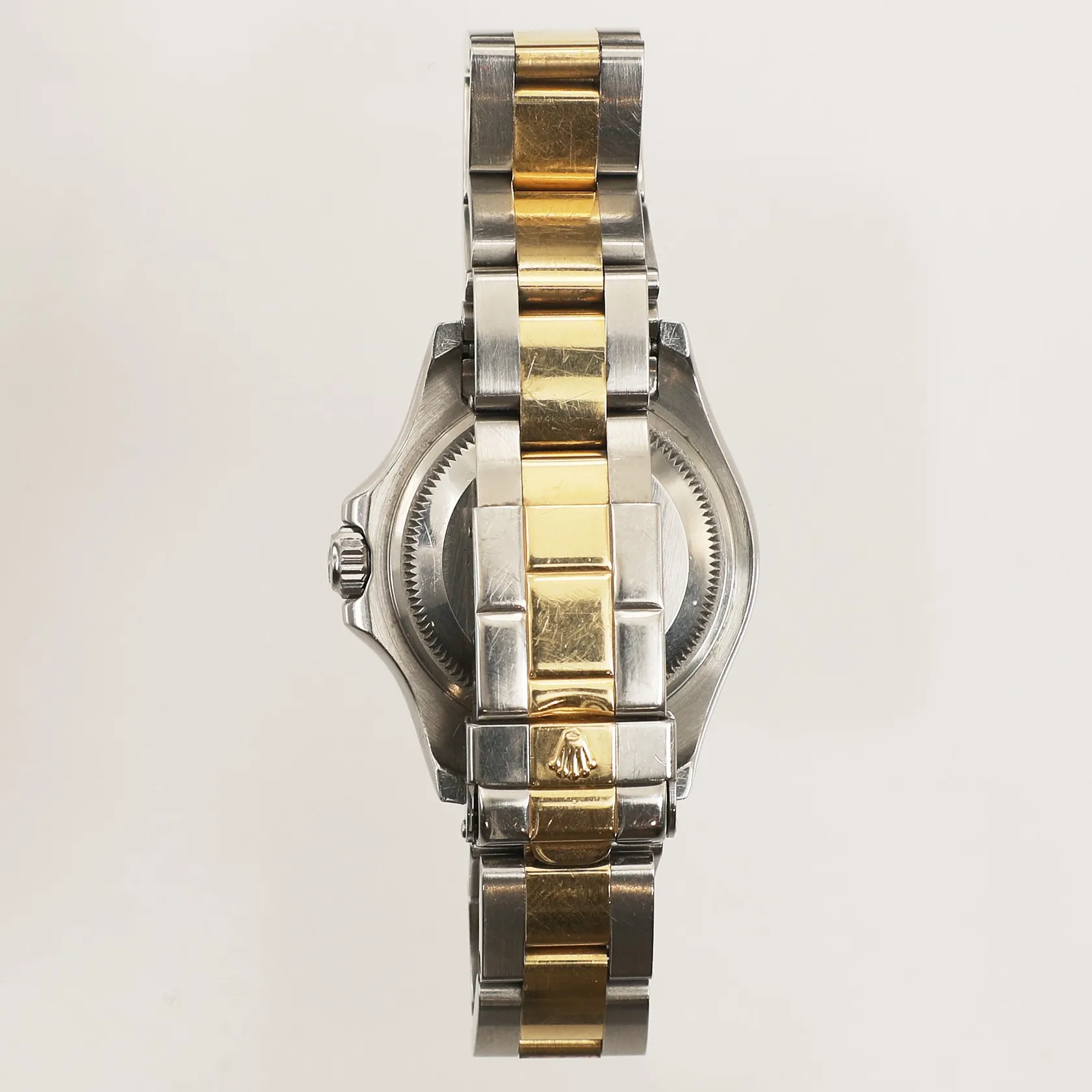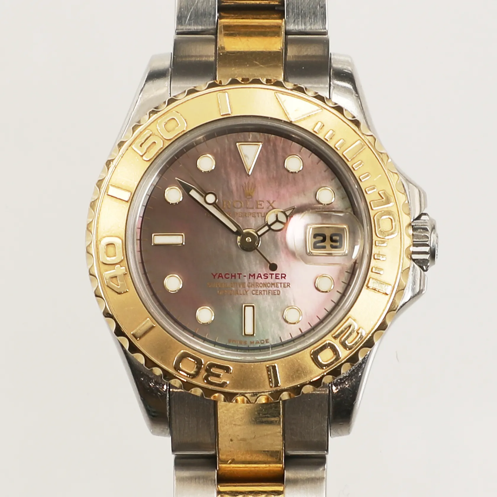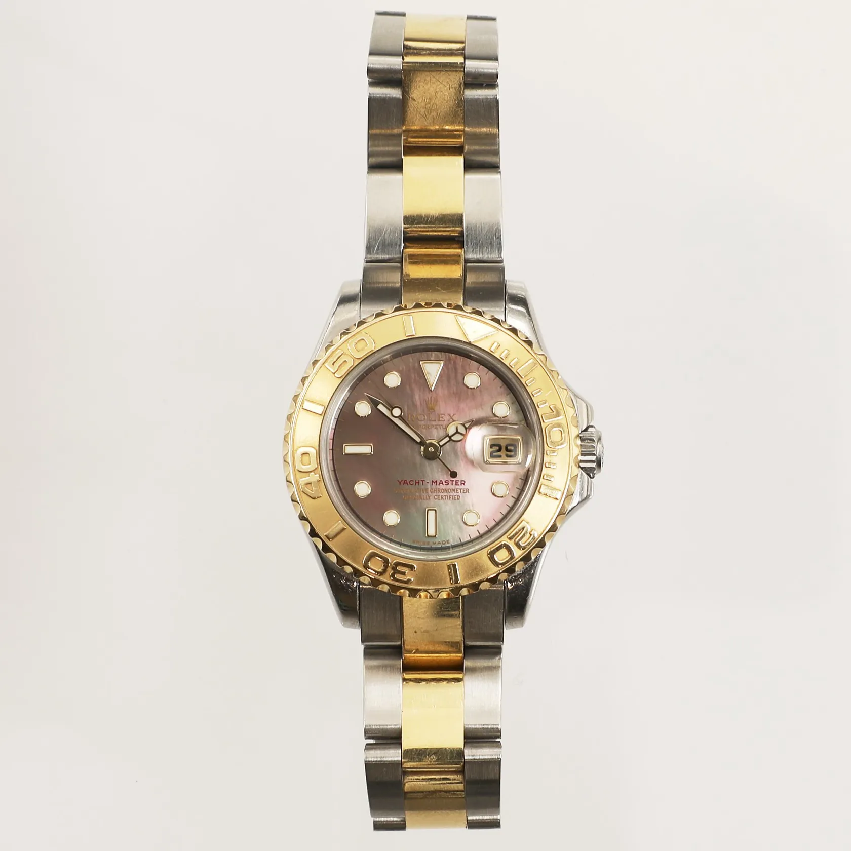 Damur Rolex Yacht-Master, stål/ guld, automatisk, datum, 29mm, referensnummer: 169623, serienummer: D384233, calnr. 2235, verknummer: 2068943, boettnummer: 2270, ej certifikat, bruksskick, repig länk, box, ytterkartong, kvitto från Kaplans år 2019