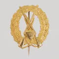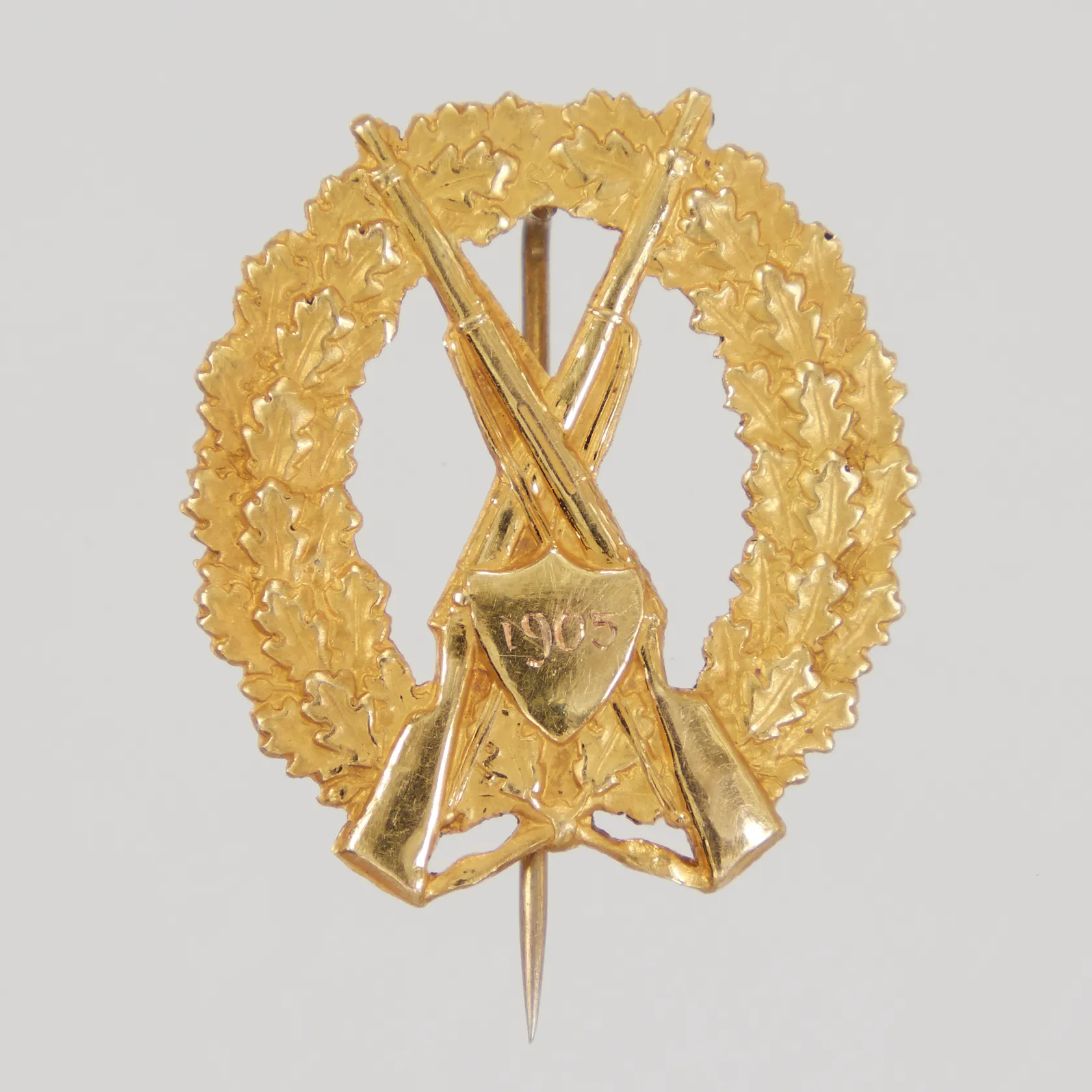 Brosch/ medalj, skytte, ca 25x28mm, gravyr text: 1905, nål oädel metall, 18K Vikt: 3,4 g.