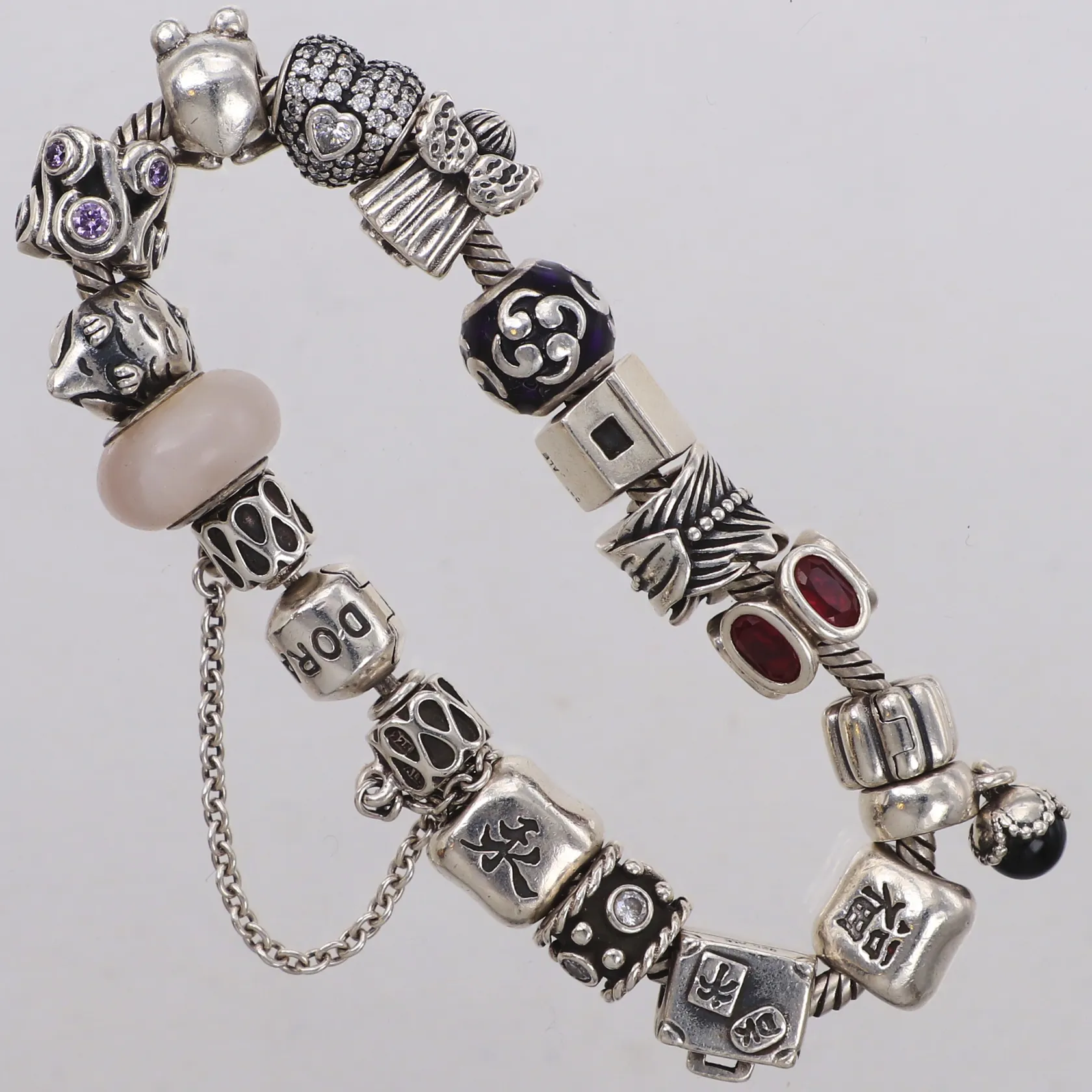 Armband Pandora med berlocker, längd ca 18cm, bredd 3-14mm, silver 925/1000 Vikt: 67,9 g.