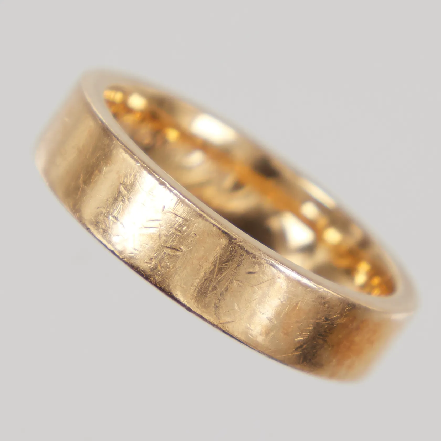 Ring stl 18, bredd 5mm, gravyr, Schalin, 18K Vikt: 8,4 g.