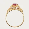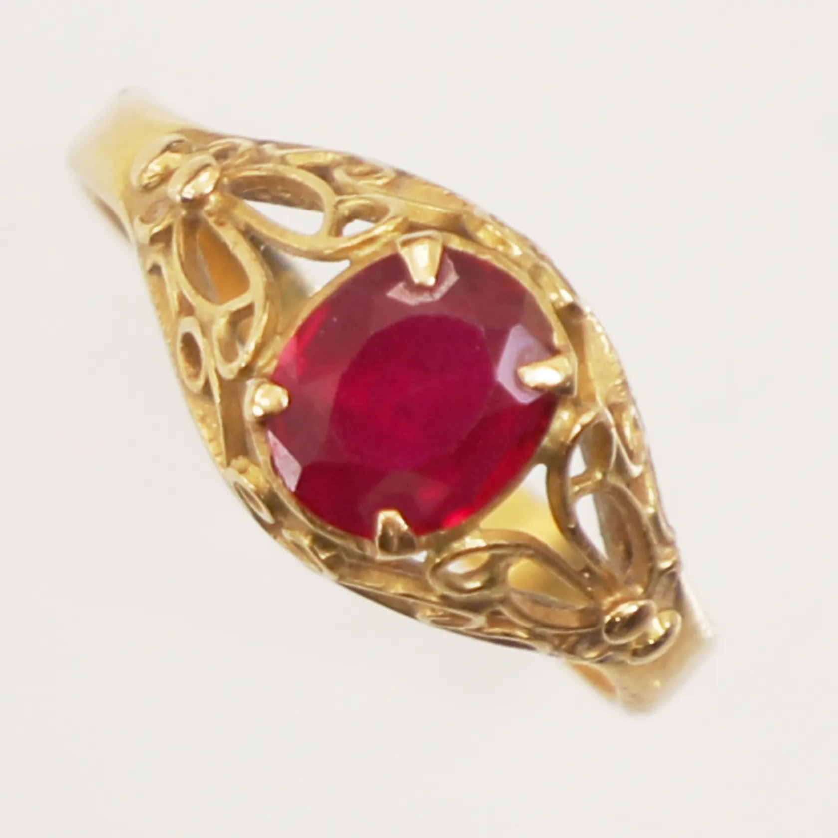 Ring med rubin möjligen syntetisk, stl 16, bredd 8,3mm, 21K Vikt: 2,5 g.