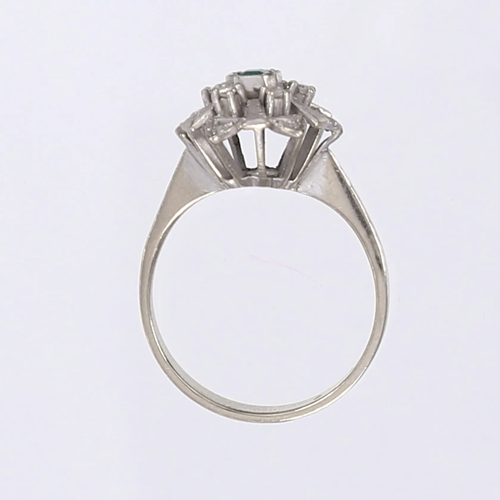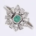 Ring med trappslipad smaragd samt åttkantsslipade diamanter 12x ca 0,01ct, stl 19, bredd 3-12mm, ostämplad, vitguld 14K Vikt: 4,6 g.