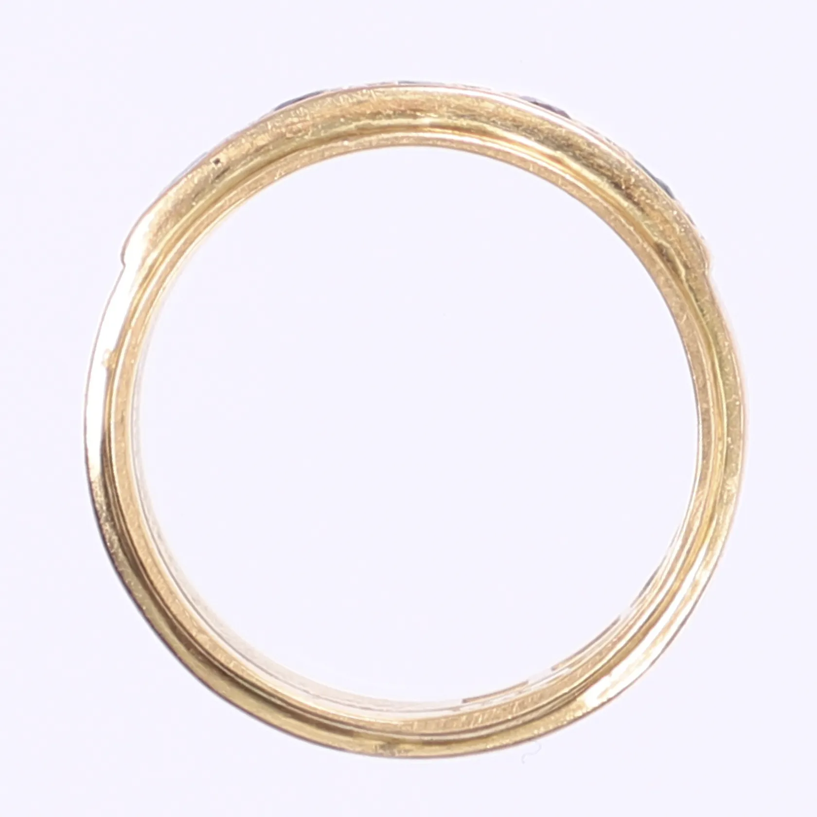 Ring med röda samt blå stenar stl 18¼ bredd 5mm, gravyr, 18K Vikt: 6,2 g.