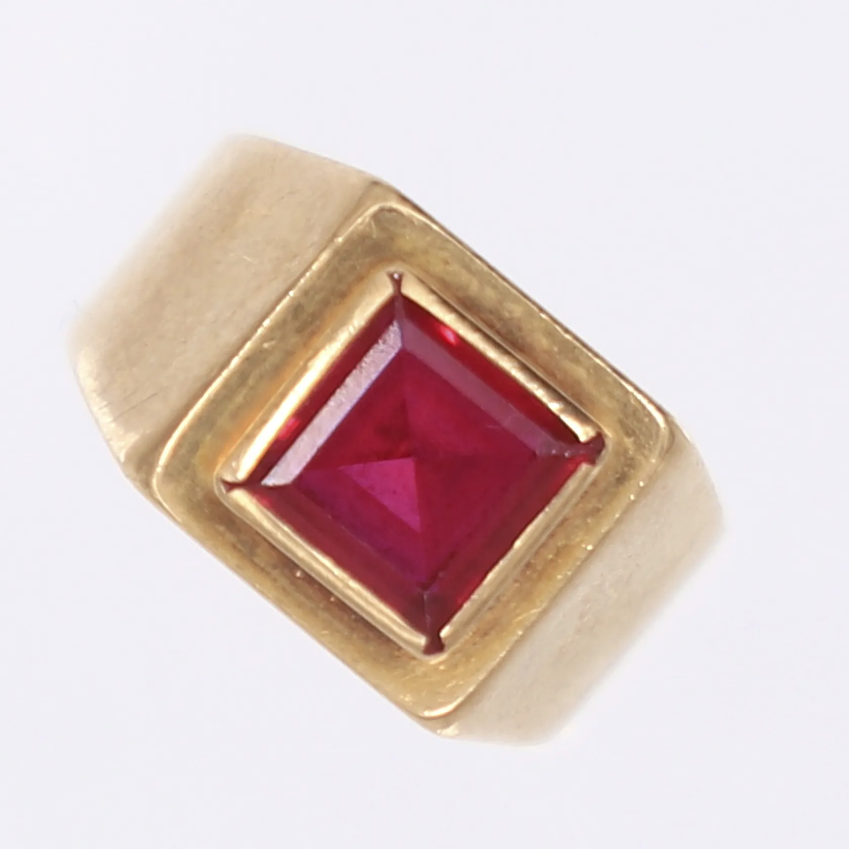 Ring med röd sten, stl 15½, bredd 5-10mm, 18K Vikt: 3,9 g.