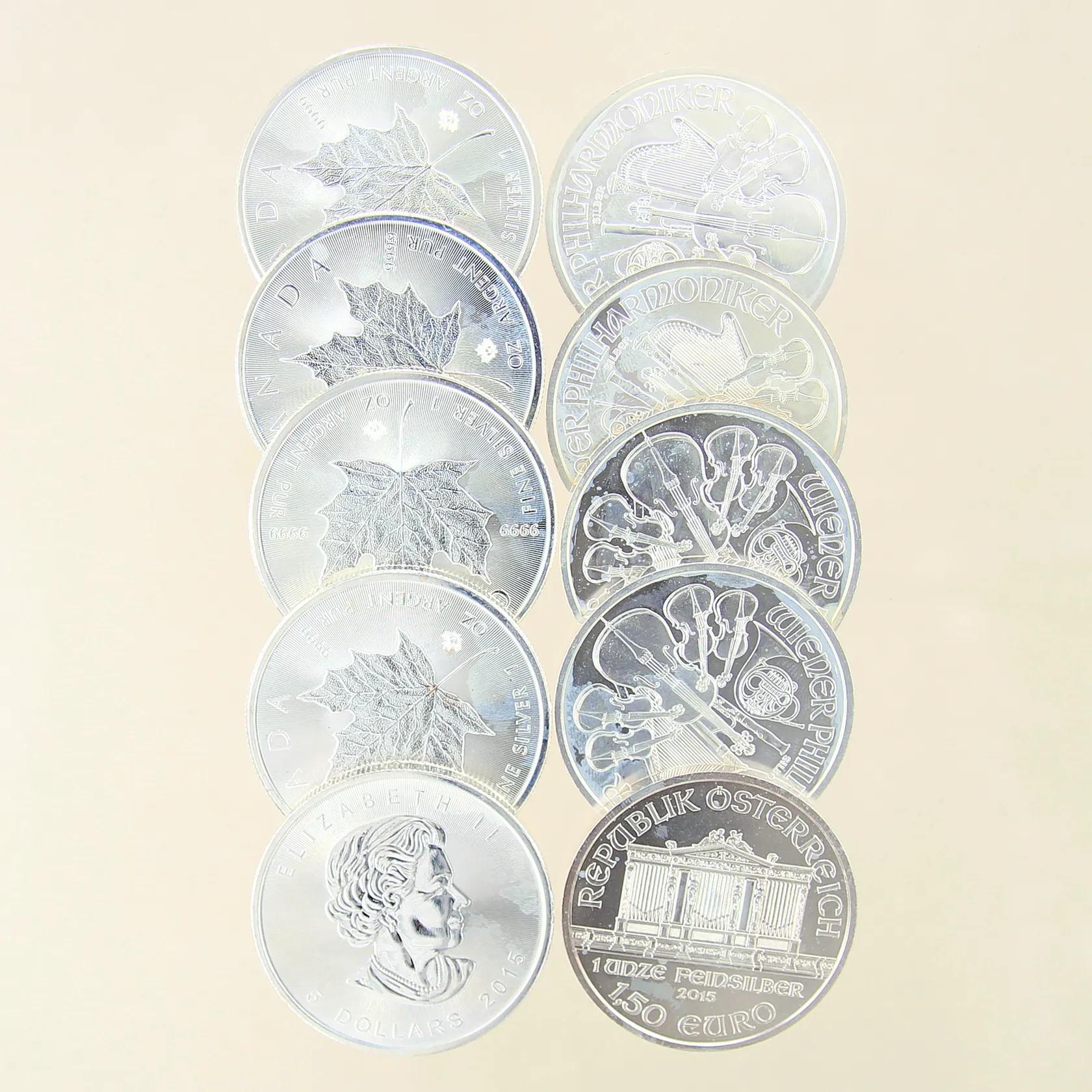 Mynt, fem stycken Elizabeth II, 5 Dollars, 2015, Canada, Ø38mm, fem stycken Weiner Philharmoniker, Republik Osterreich, 1,50 Euro, 2015, Ø37mm, silver 999/1000 Vikt: 312,3 g.
