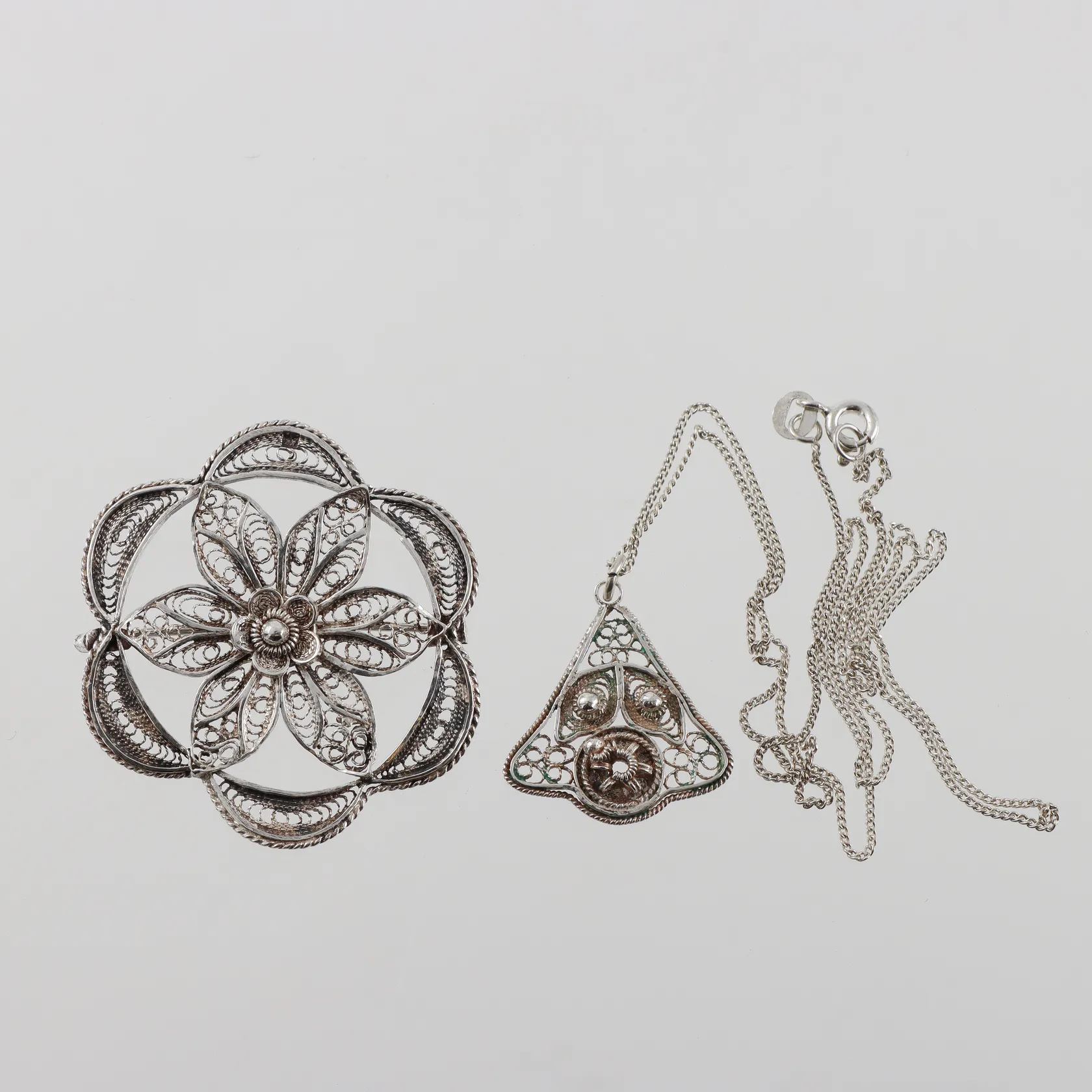 Brosch Ø39,5mm och hänge filigranarbete, silver troligtvis ostämplad eller väldigt otydligt + kedja 45cm , silver 925/1000 Vikt: 8,7 g.