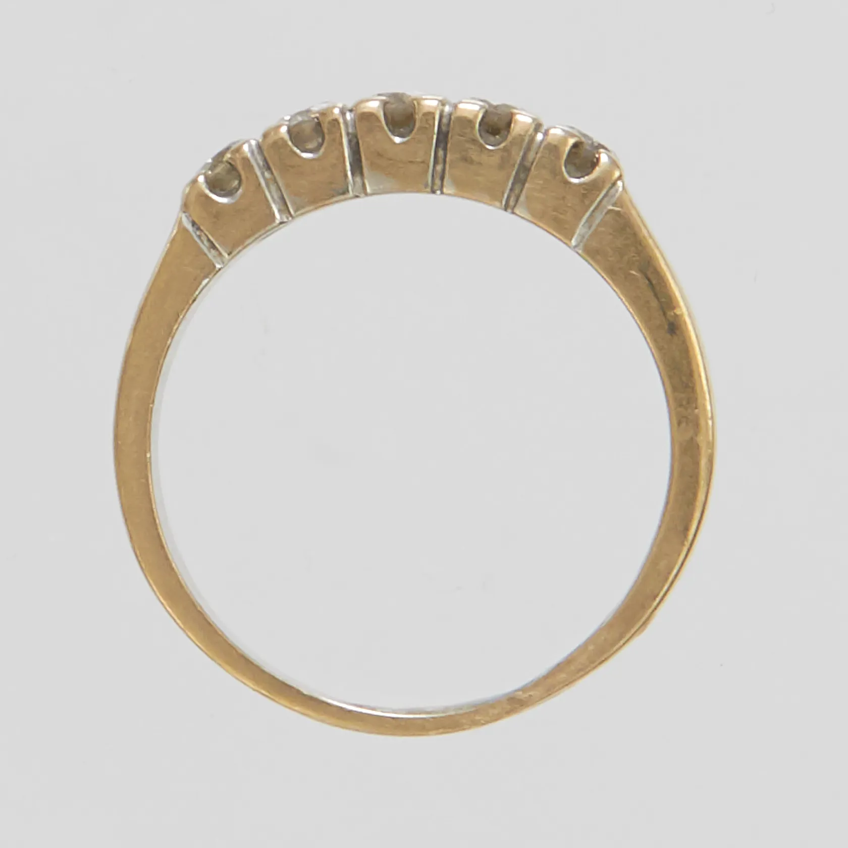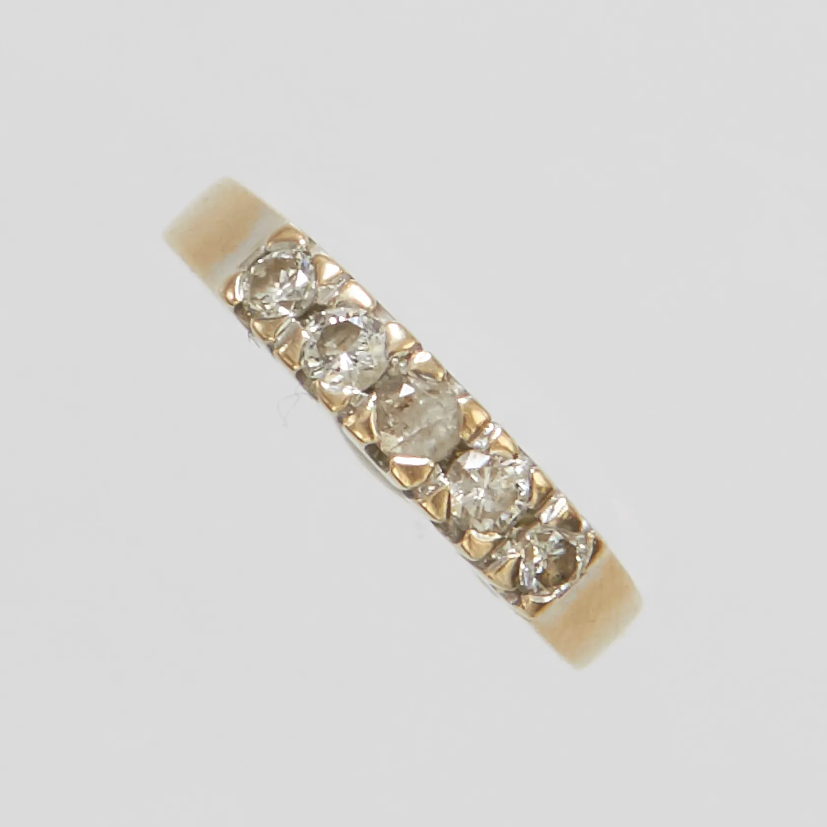 Ring med diamanter 5 x ca 0,10ct, stl17¾, bredd 2-4mm, vitguld, skadade diamanter, behov av omrodering, 18K Vikt: 4,6 g.