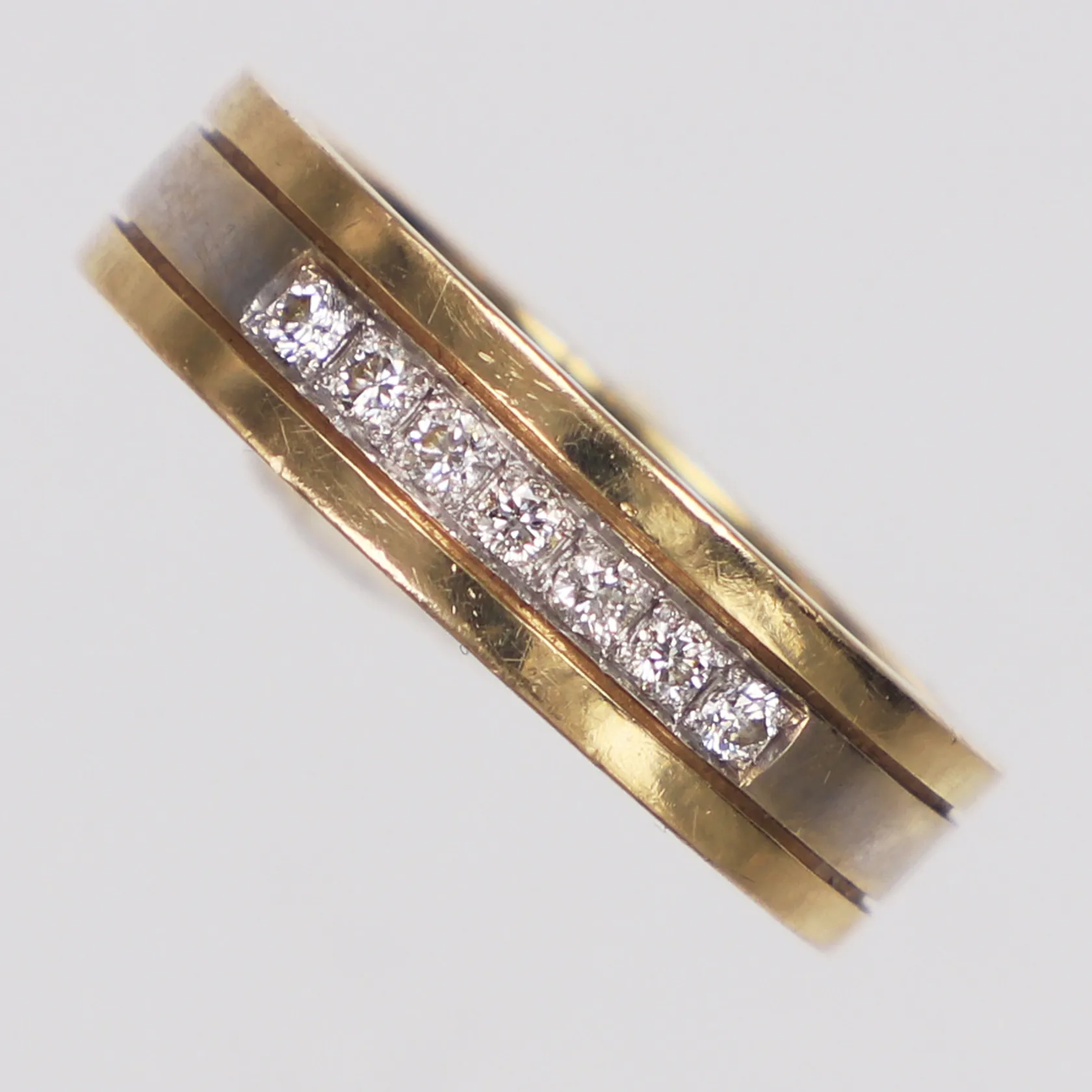 Ring diamanter 7 x ca0,02ct, stl 17¾, bredd 5,2mm, tvåfärgad, 14K Vikt: 6,4 g.
