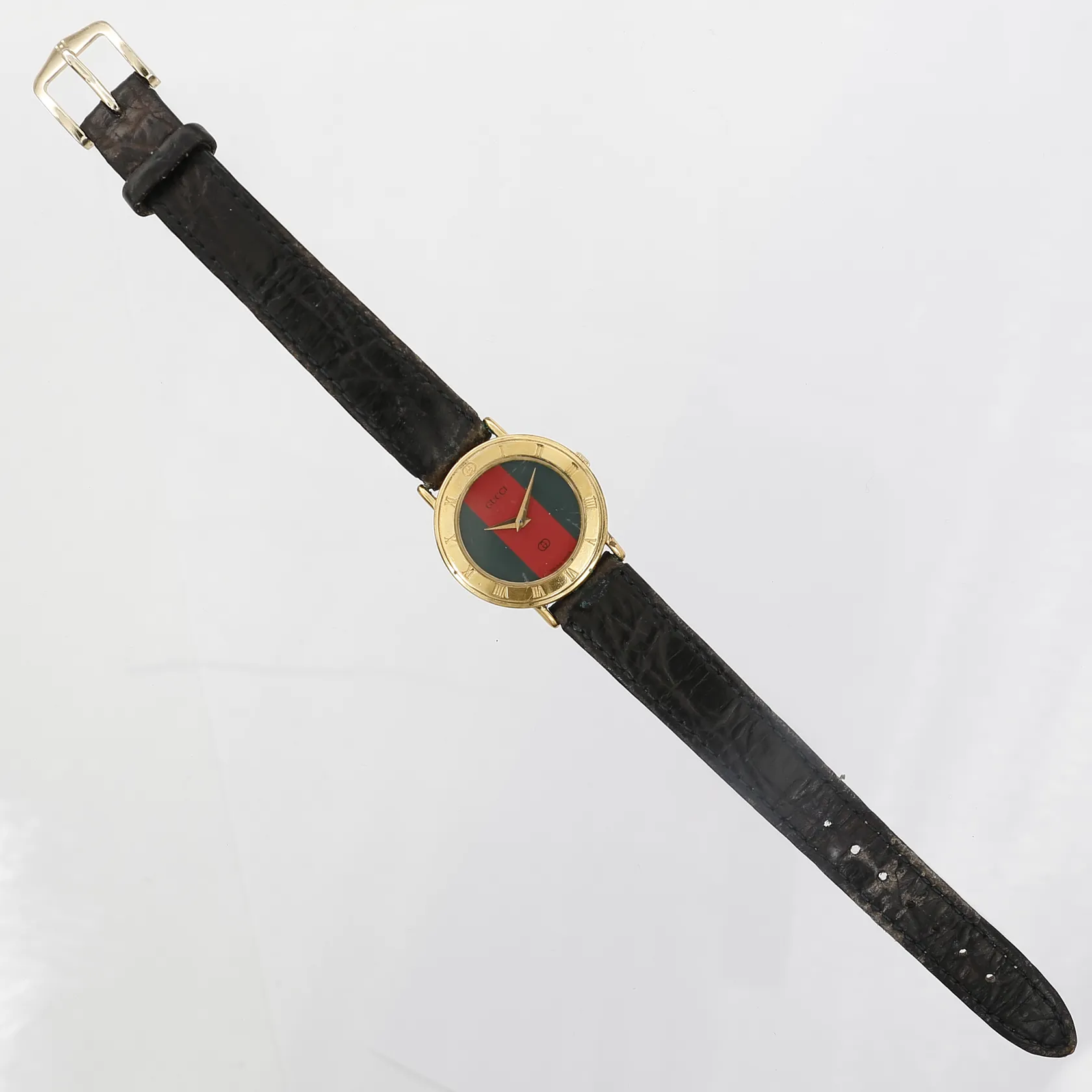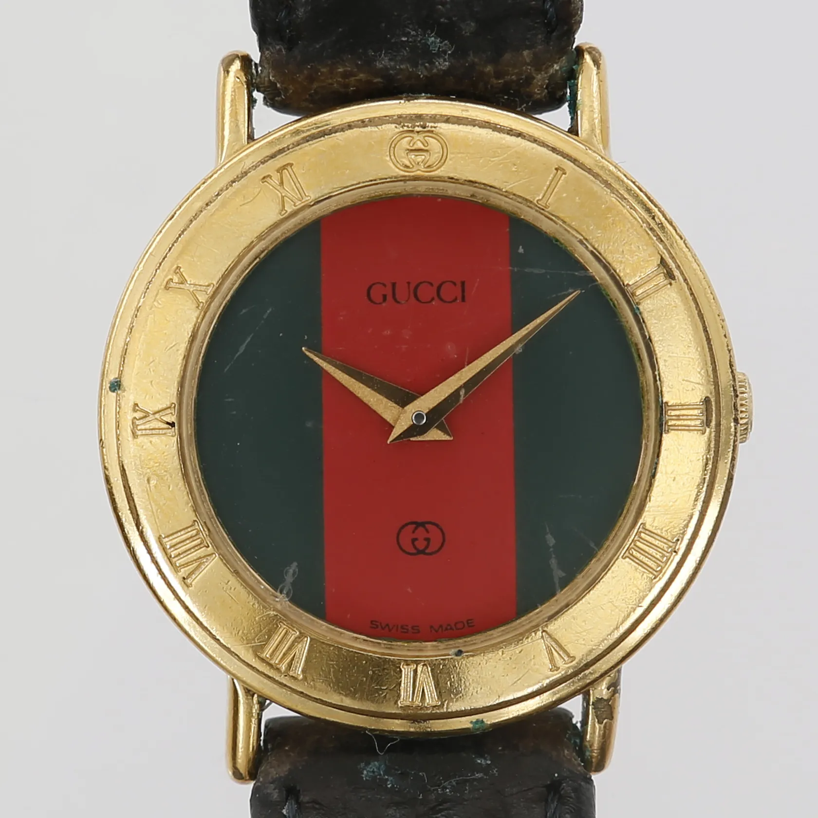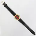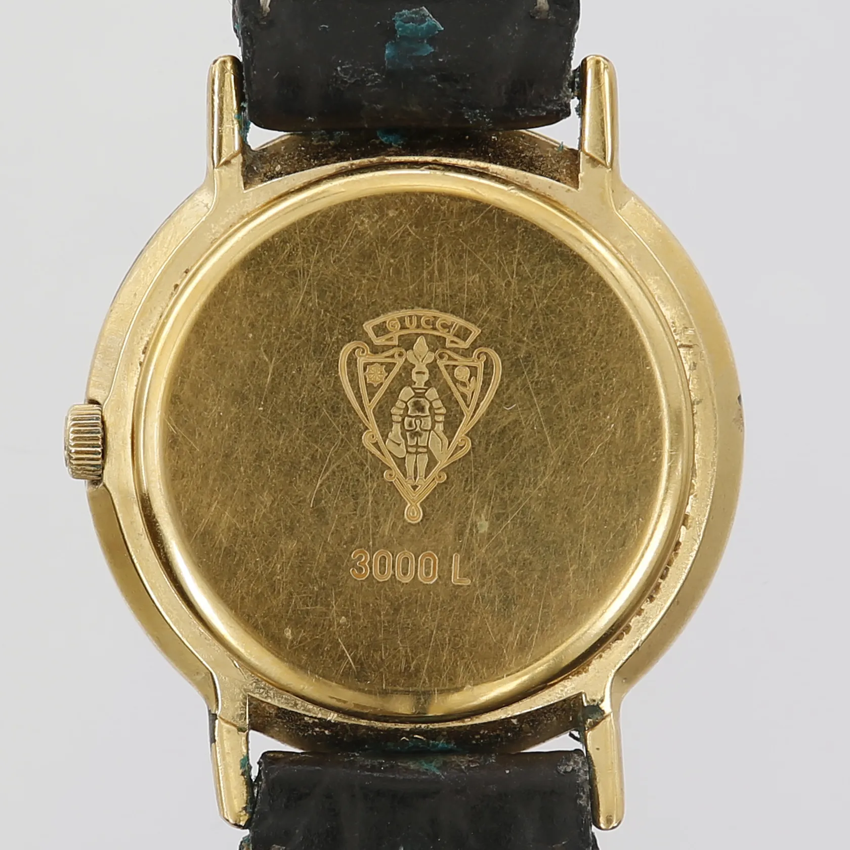 Damur Gucci, Ø26mm, quartz, plexiglas, förgyllt stål, läderarmband, numrerad: 3000 L, serie-nr: 0022013, bruksslitage/repor, läderarmband ej original.