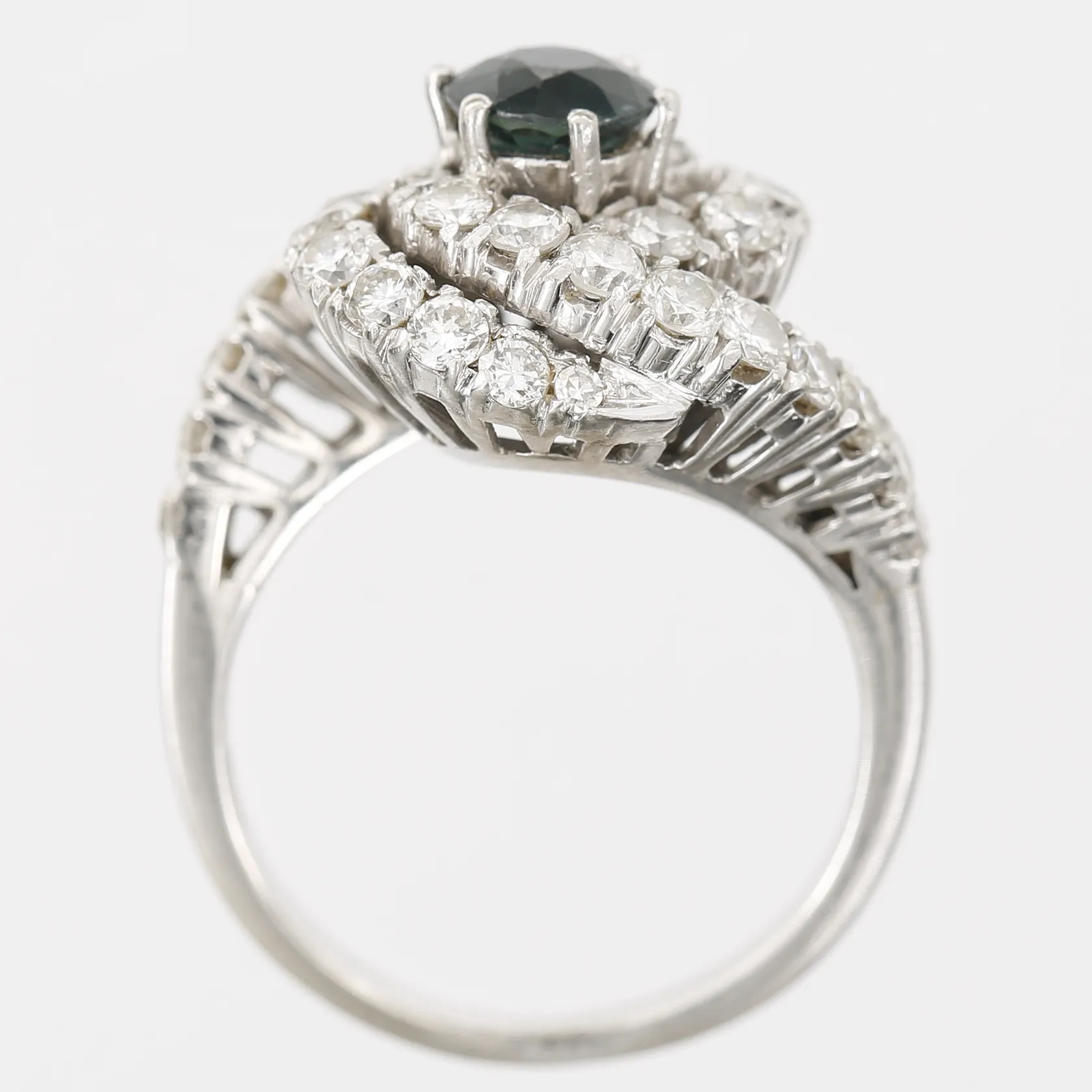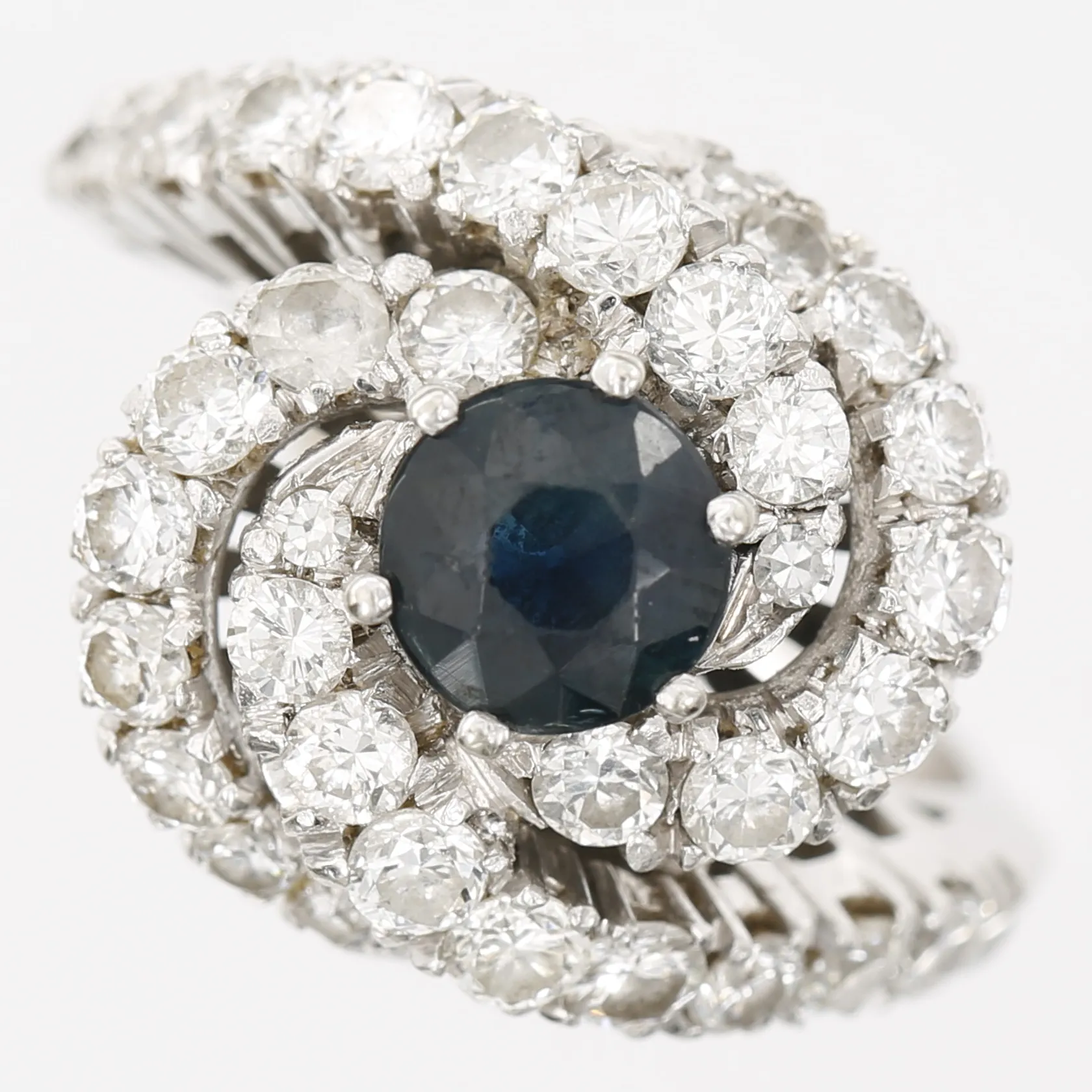 Ring med mörkblå safir ca 1,00ct samt briljantslipade diamanter 31 x ca 0,03ct, 3 x ca 0,005ct, stl: 16¼, bredd: 15mm, slitage på safir, en diamant utbytt till vit sten, 18K vitguld Vikt: 5,9 g.