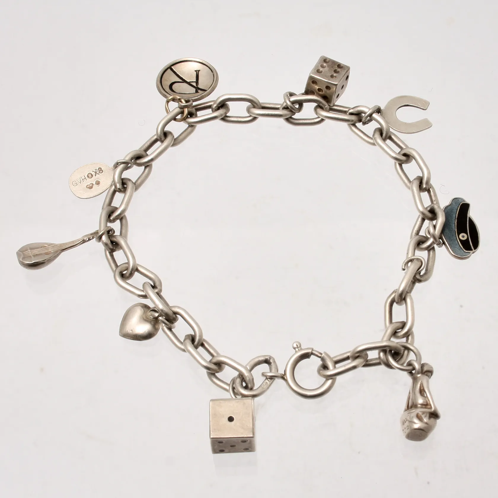 Armband i silver, 19cm, Ankar, bredd 6mm, 9st berlocker, 835/1000, vikt 18,06g. Vikt: 18,1 g.