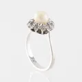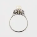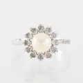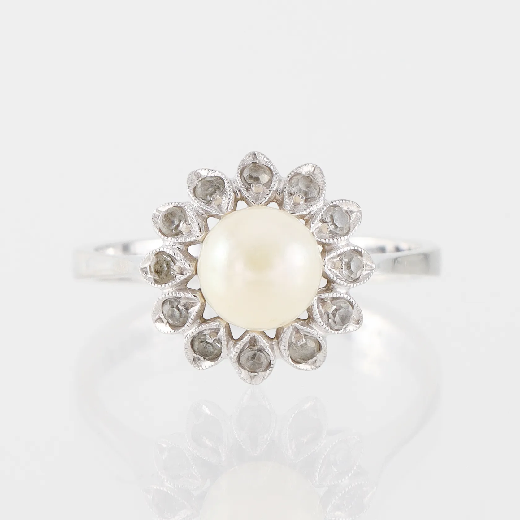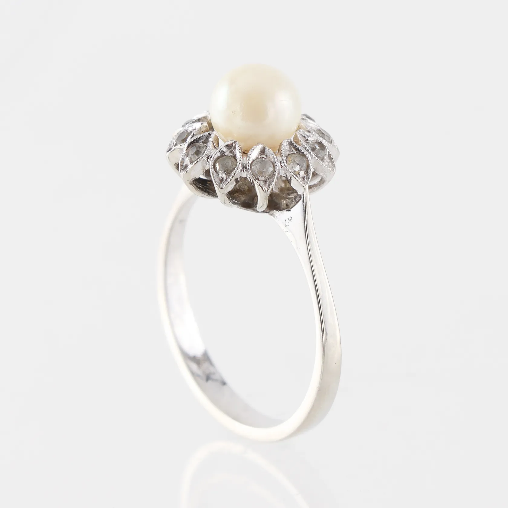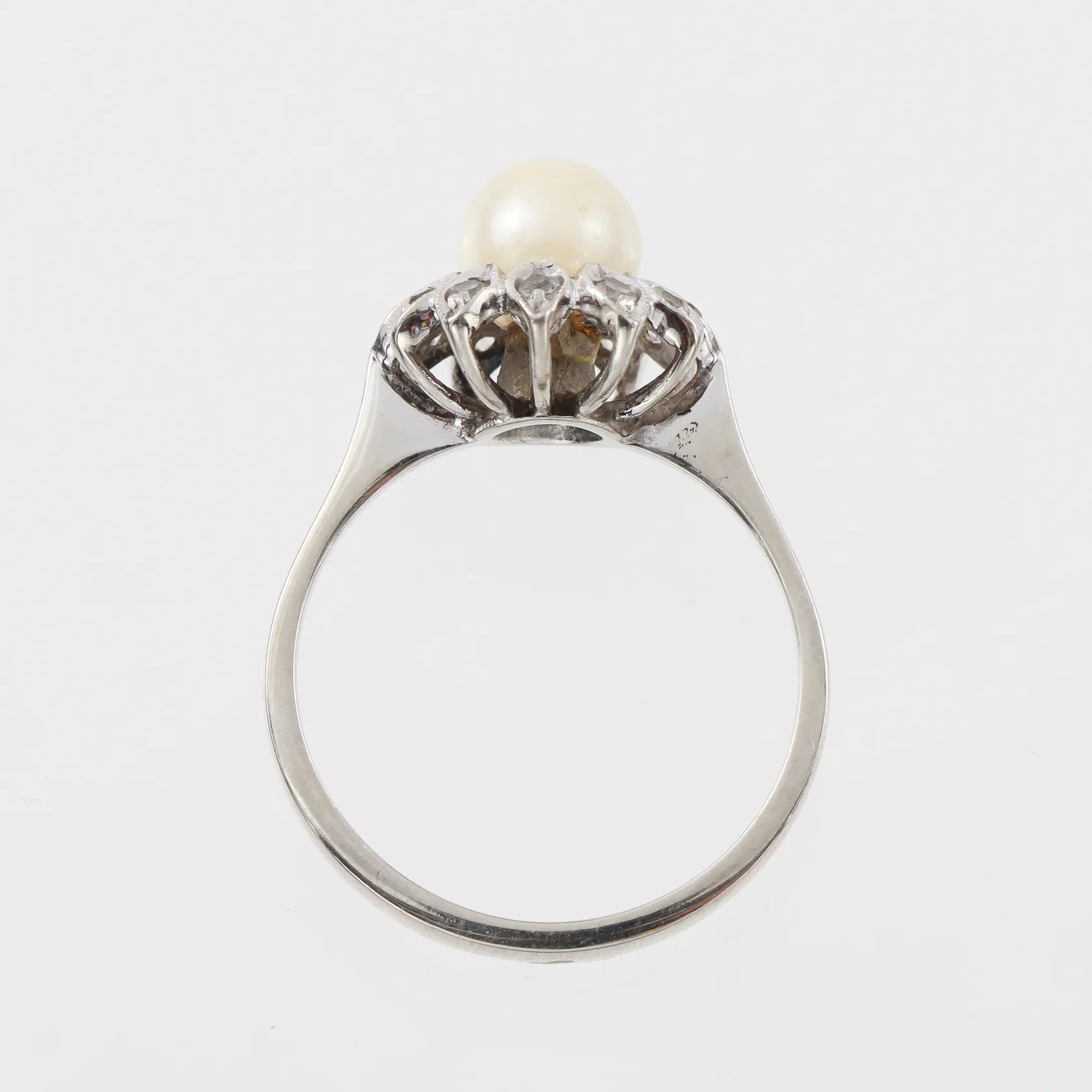 Ring med pärla och små syntetiska stenar, storlek 18 mm, bredd 2.7-12.6 mm, 18k. Vikt: 4,4 g.