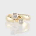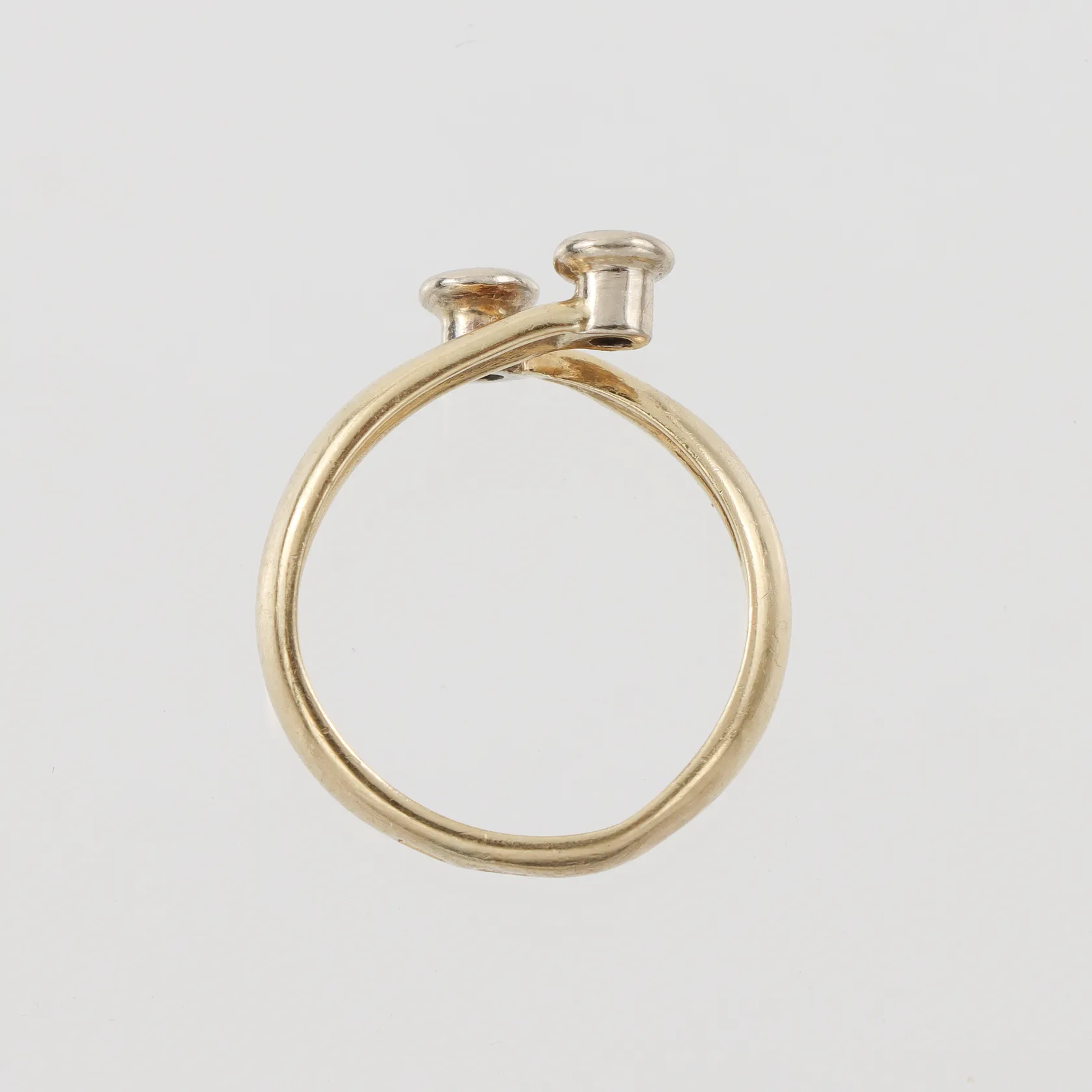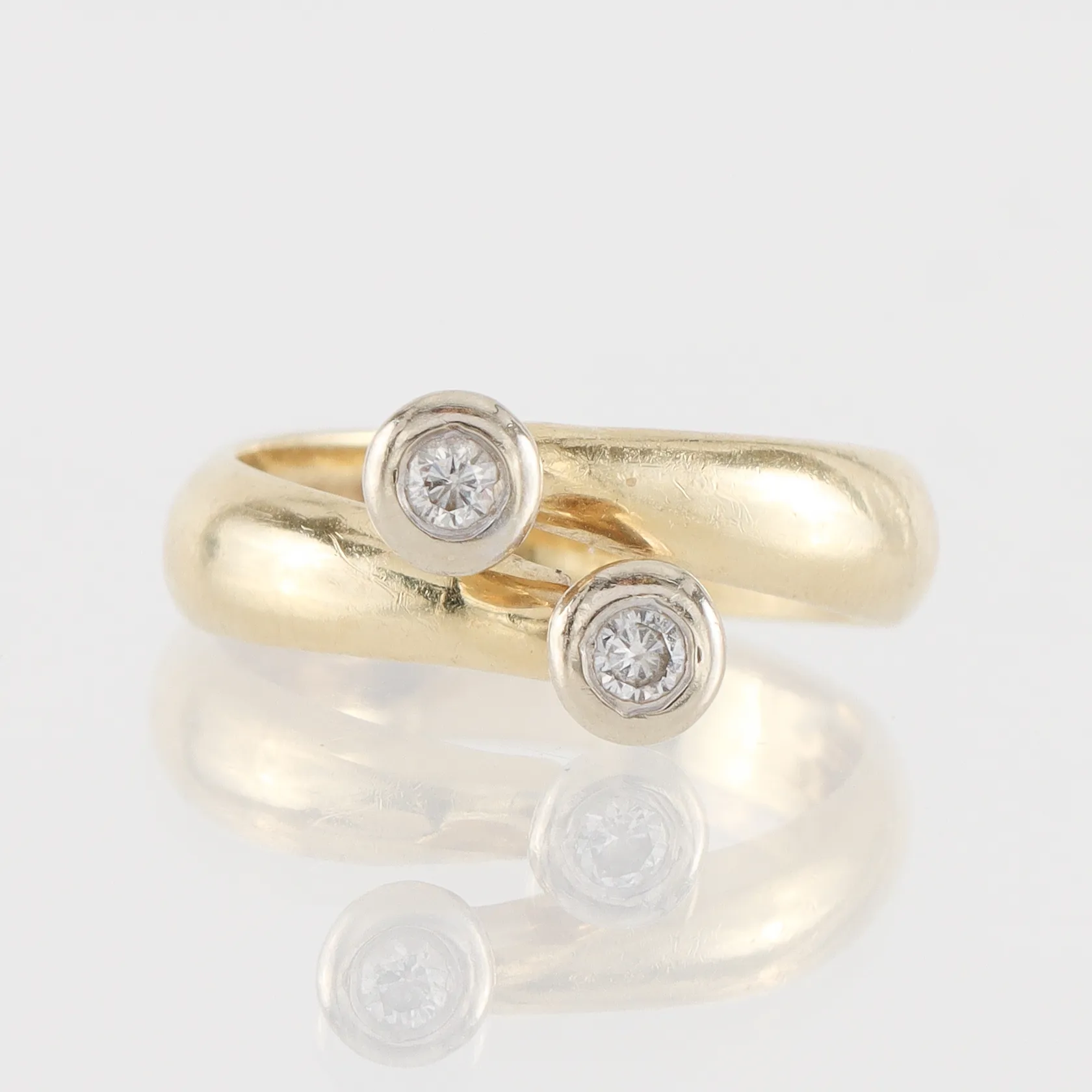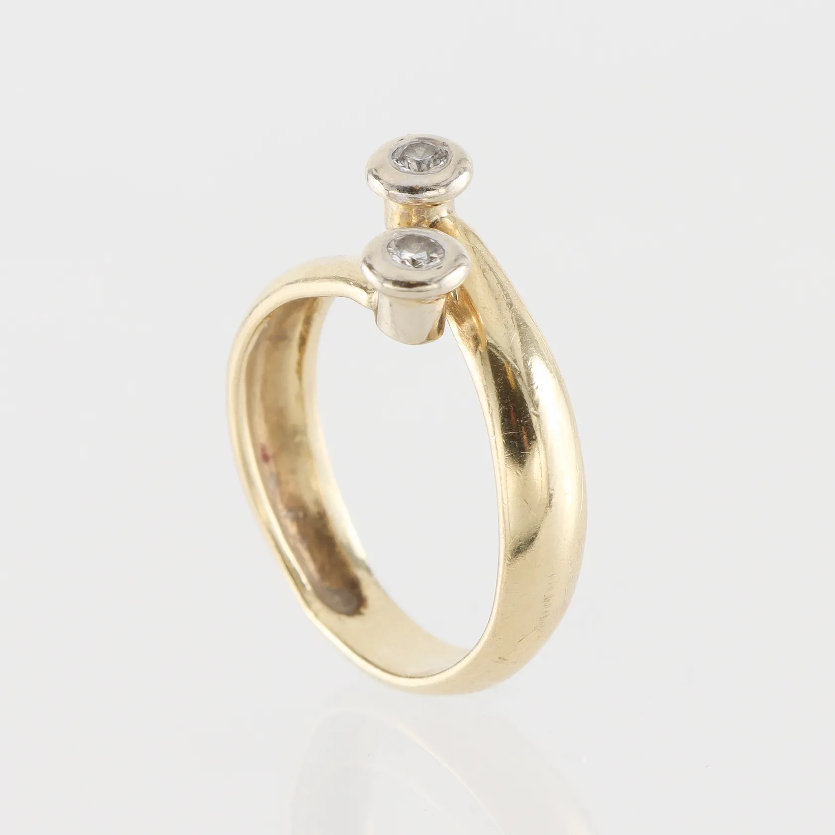 Ring med diamanter ca 2x0,10ct, storlek 17 mm, bredd 3.9-9.6 mm, ojämn form, 14k. Vikt: 4 g.