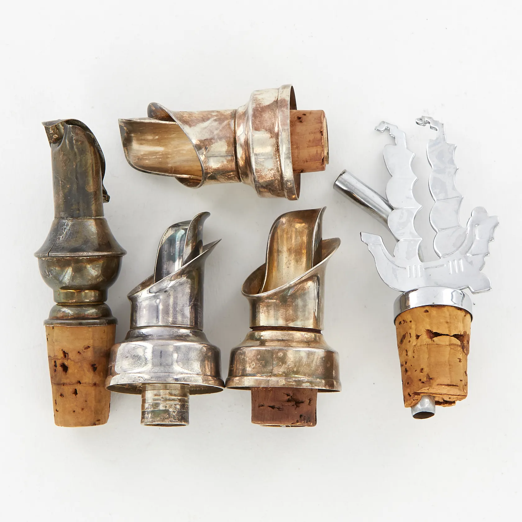4 vinkorkar i nysilver, en vinkork i metall, en saknar kork, sprickor.