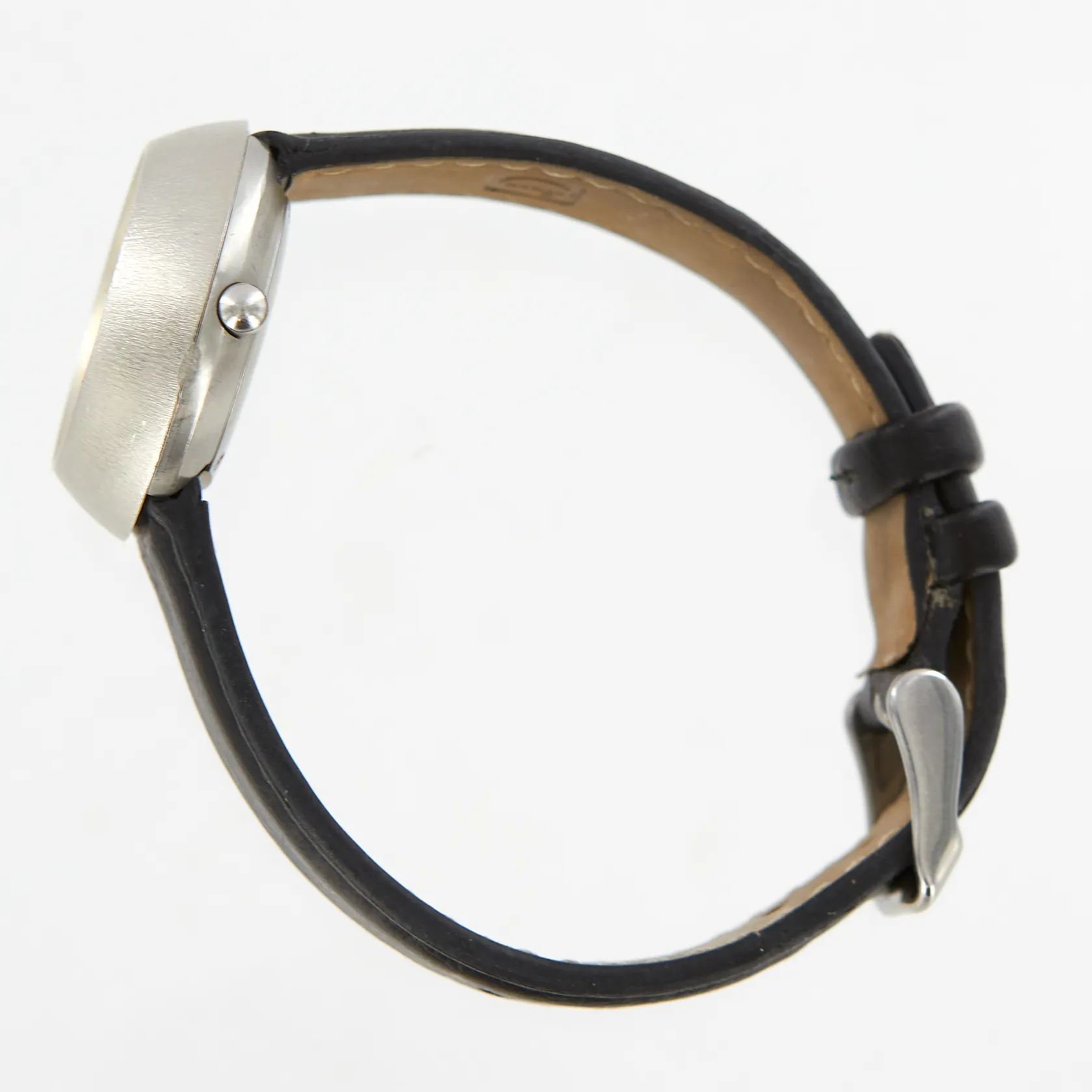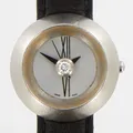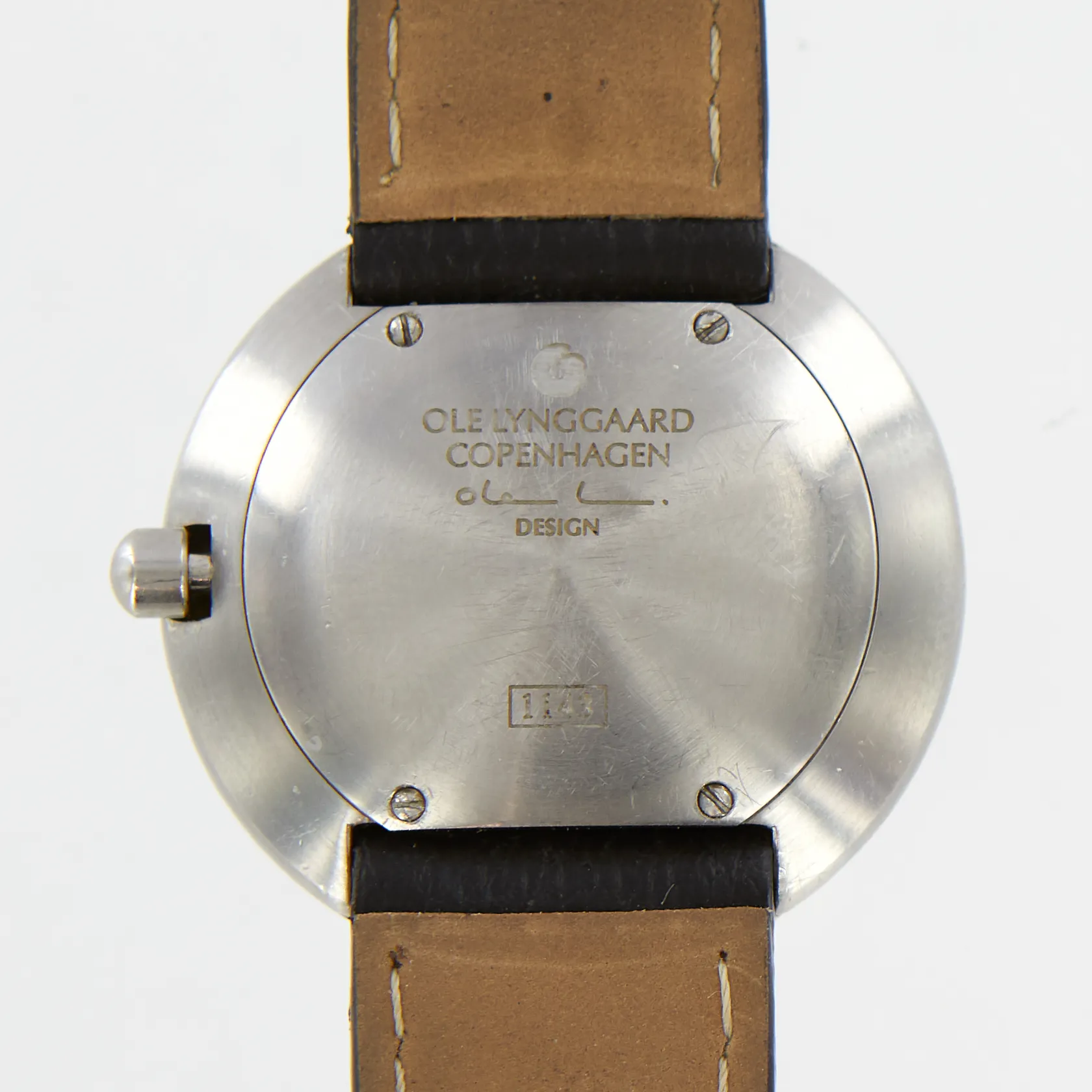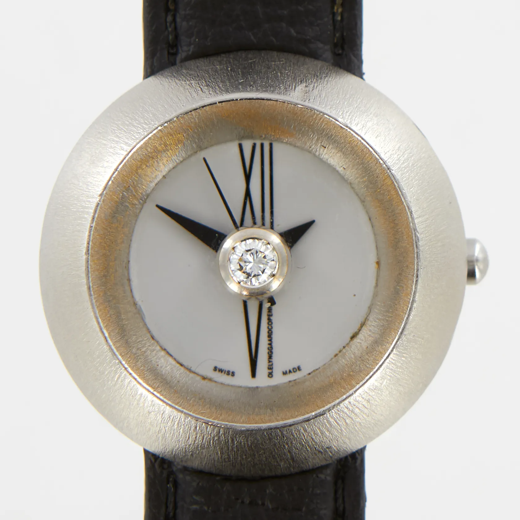 Damur Ole Lynggaard, Ø30mm, stål, diamant ca 0,15ct, stål, nr: 1143, quartz, läderband 22,5cm ej original, i behov av batterbyte, repor på glas, inga tillbehör.
