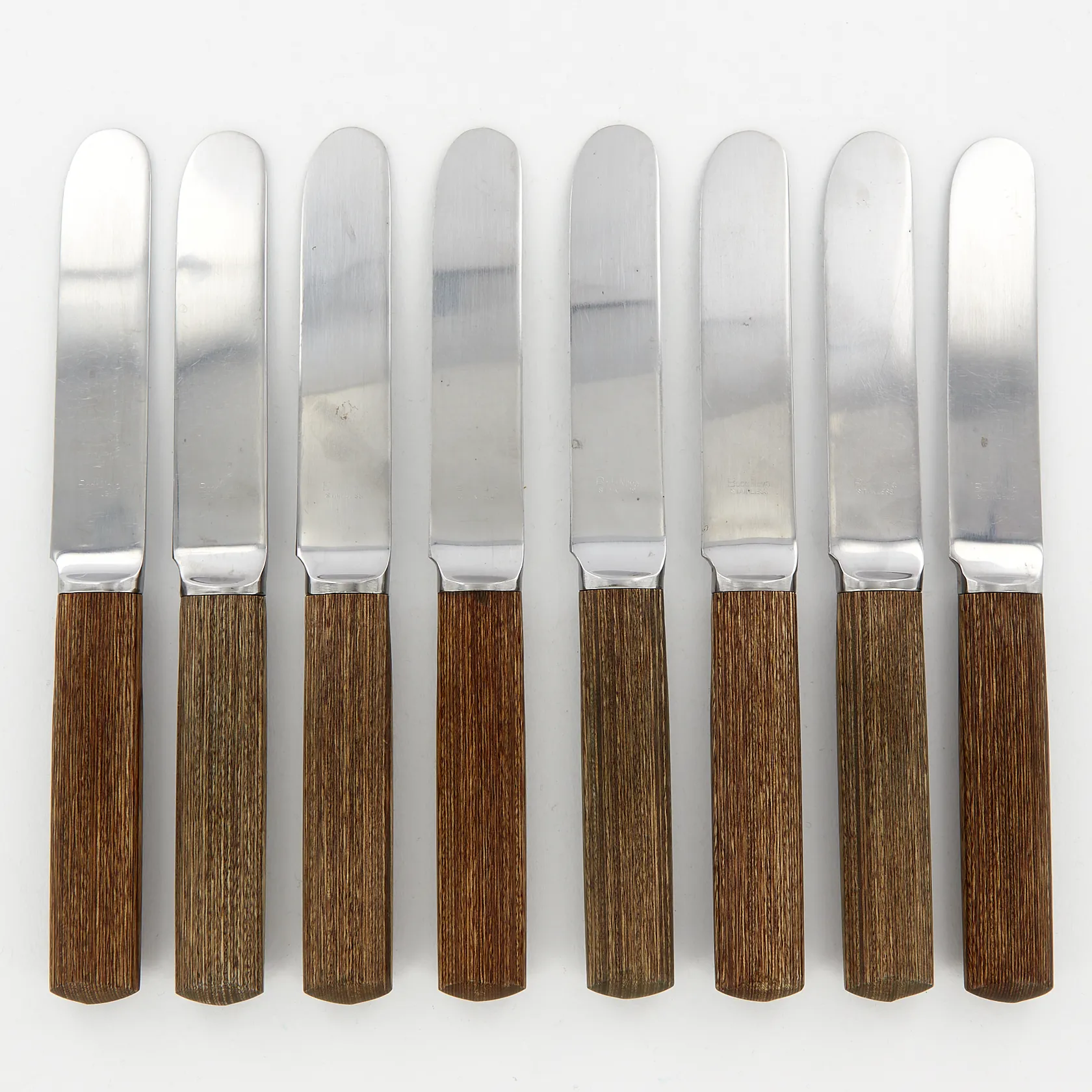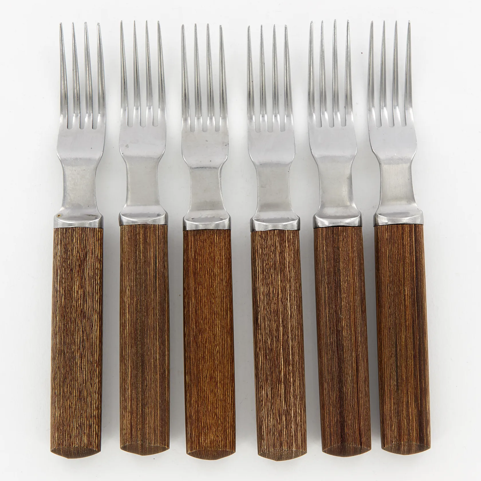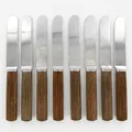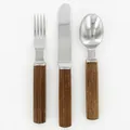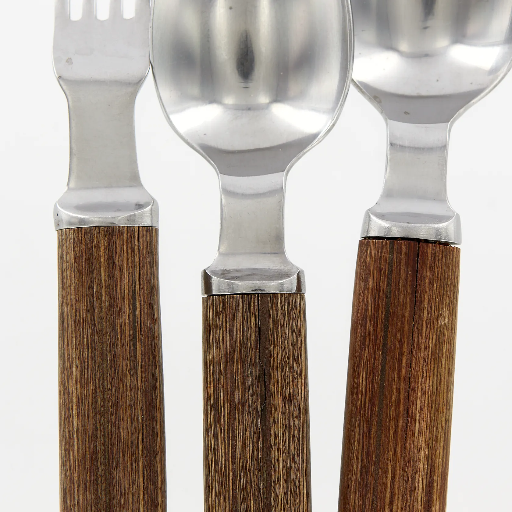 Bestick av Signe Persson Melin, Modell: Packawood, Boda Nova, 1970-tal, skaft av trä och blad i rostfritt stål, 7 skedar 18,5cm, 8 knivar 22,5cm, 6 gafflar 19,5cm, bruksslitage torrspirckor i