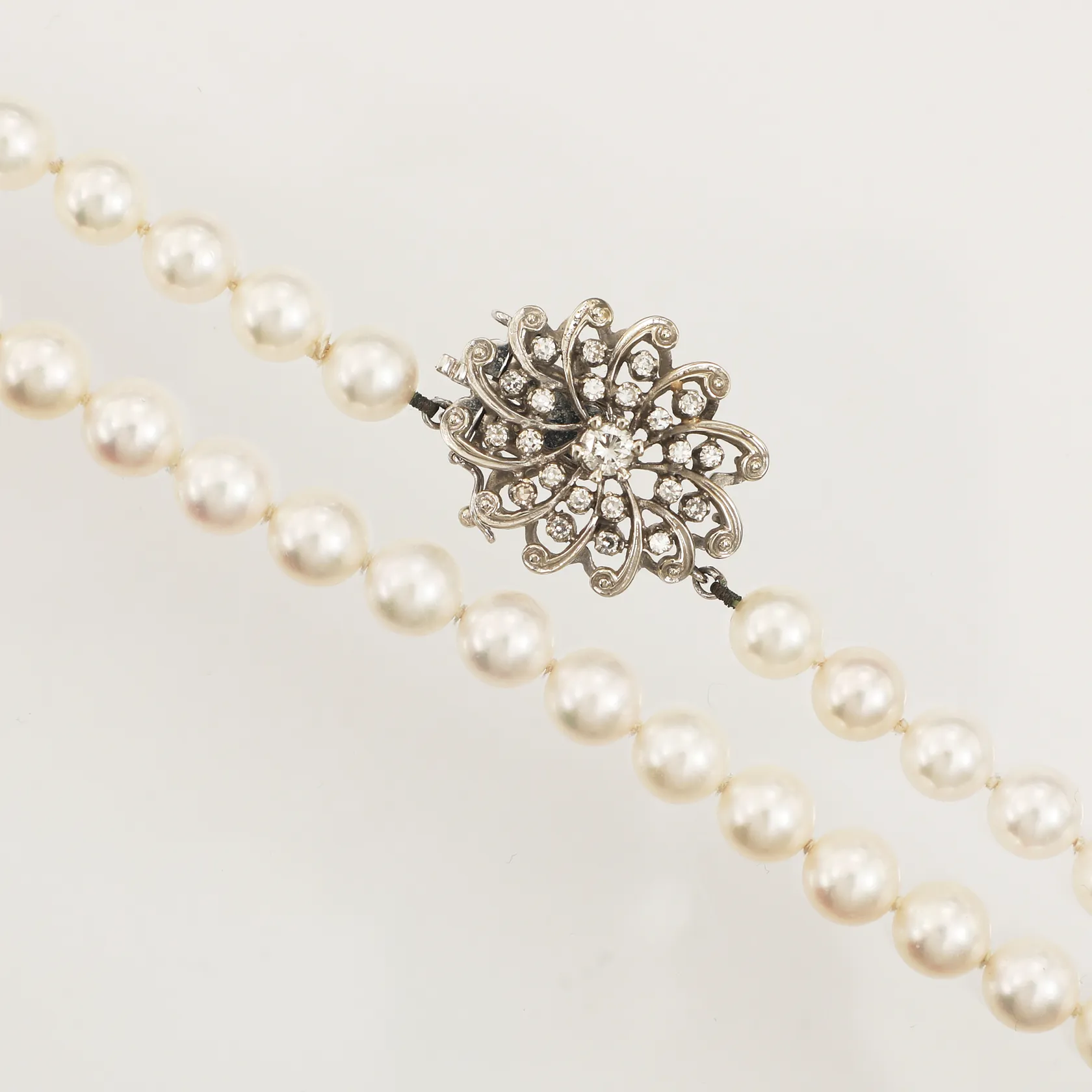 Pärlcollier med odlade saltvattenspärlor Ø7,5-7,9mm, längd ca 86cm, lås 18K med diamanter 1x ca 0,30ct + 22x ca 0,01-0,02ct 8/8-slipade, vitguld, bör träs om.