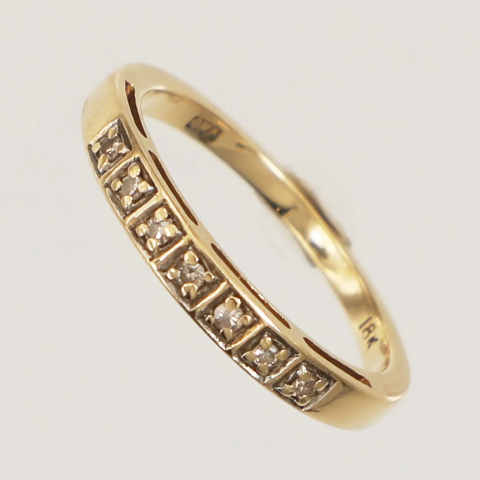Ring med diamanter 7x ca 0,01ct 8/8-slipade, stl 17, bredd 1,6-2,8mm, GHA, 18K Vikt: 2,7 g.