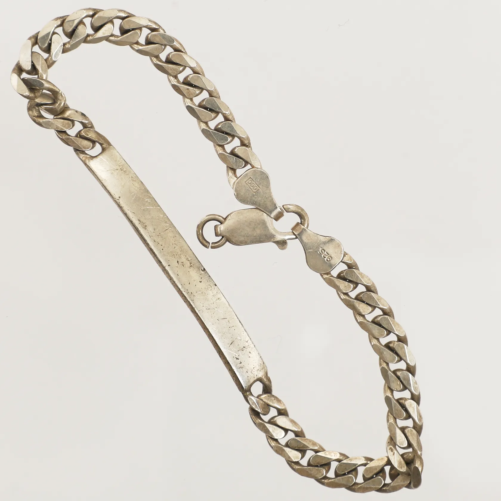 Armband Pansar med bricka, längd 19,5cm, bredd 5,3mm, defekt lås, repig, 925/1000 silver Vikt: 12,5 g.