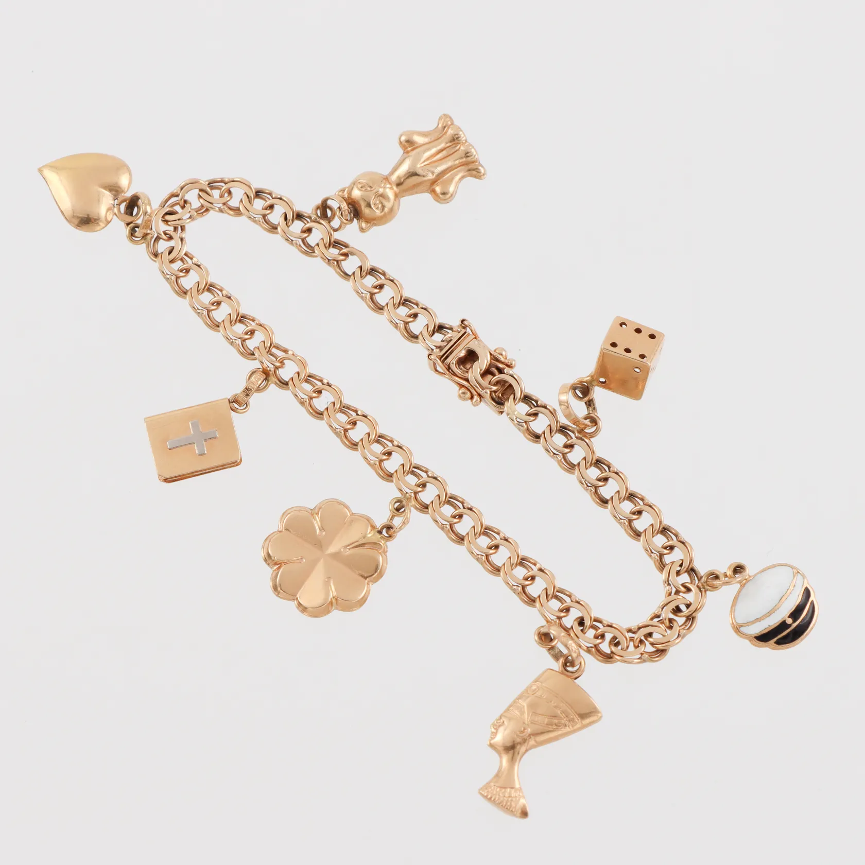Armband Bismarck med 7 st berlocker, längd ca 17 cm, bredd 4.7 mm, 18k. Vikt: 13 g.