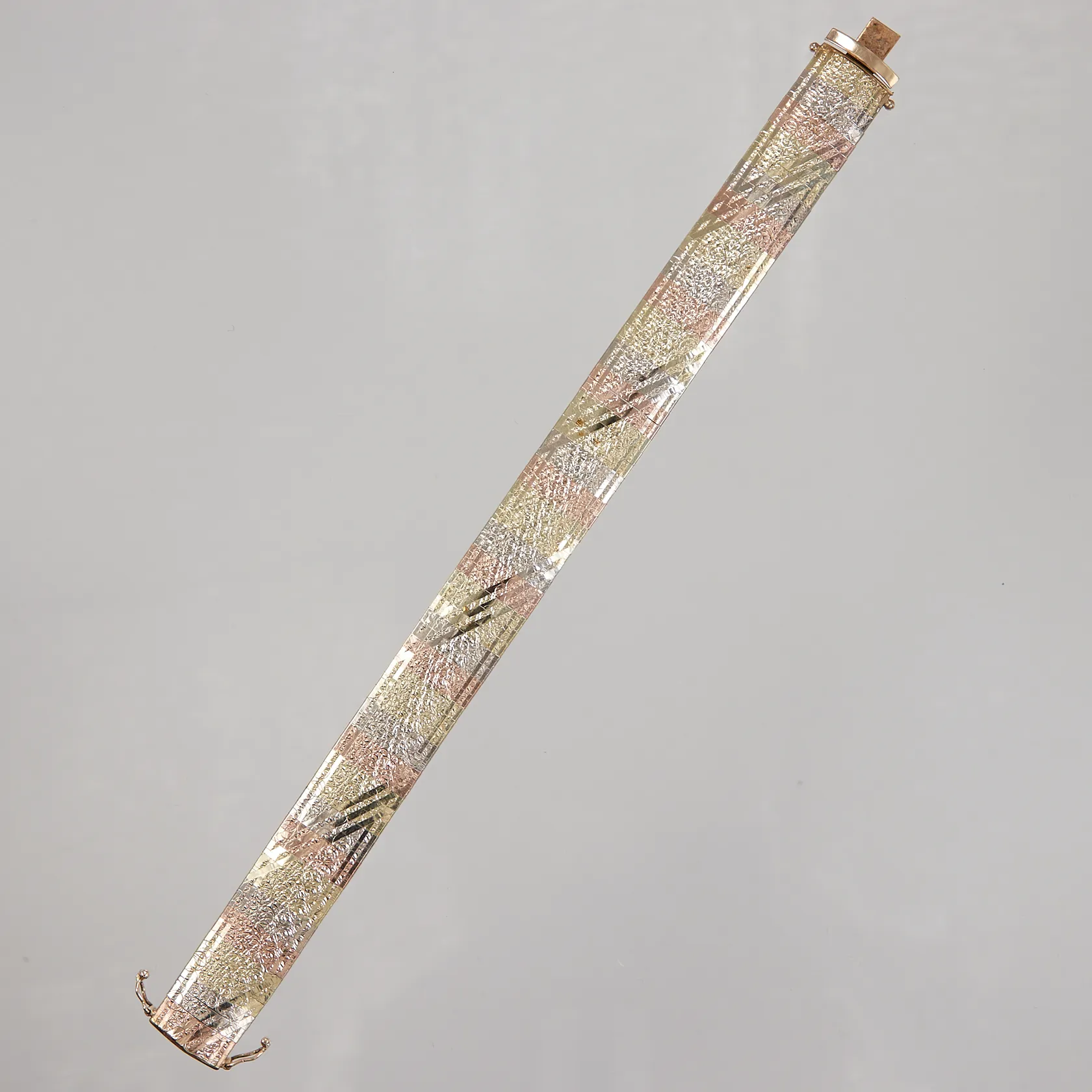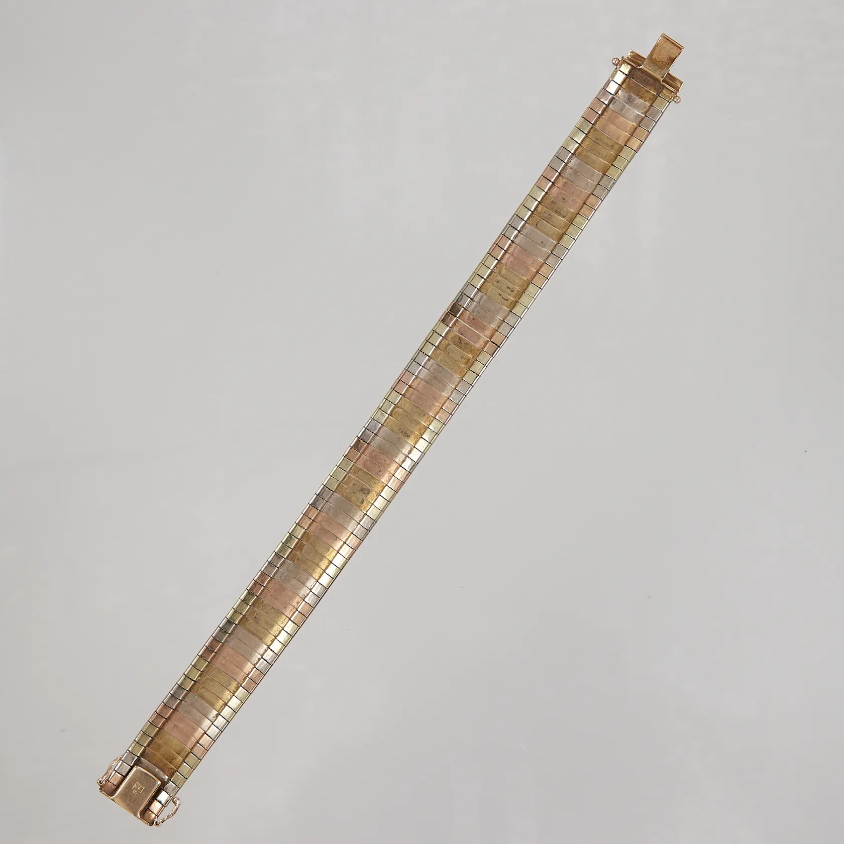 Armband, 19,5cm, bredd 15mm, trefärgat, brott i länk, 14K Vikt: 24,5 g.