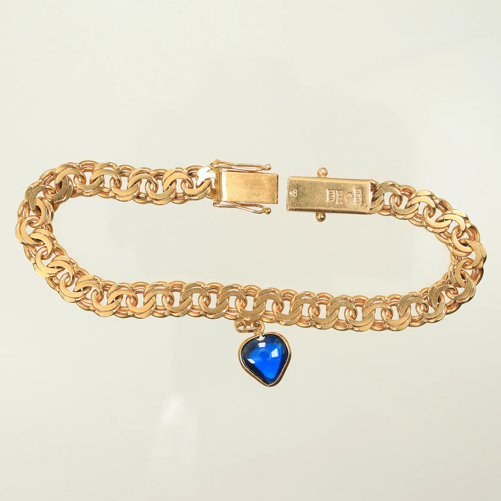 Armlänk bismarck med berlock blå sten, 18cm bredd 7mm, 18K Vikt: 21,3 g.