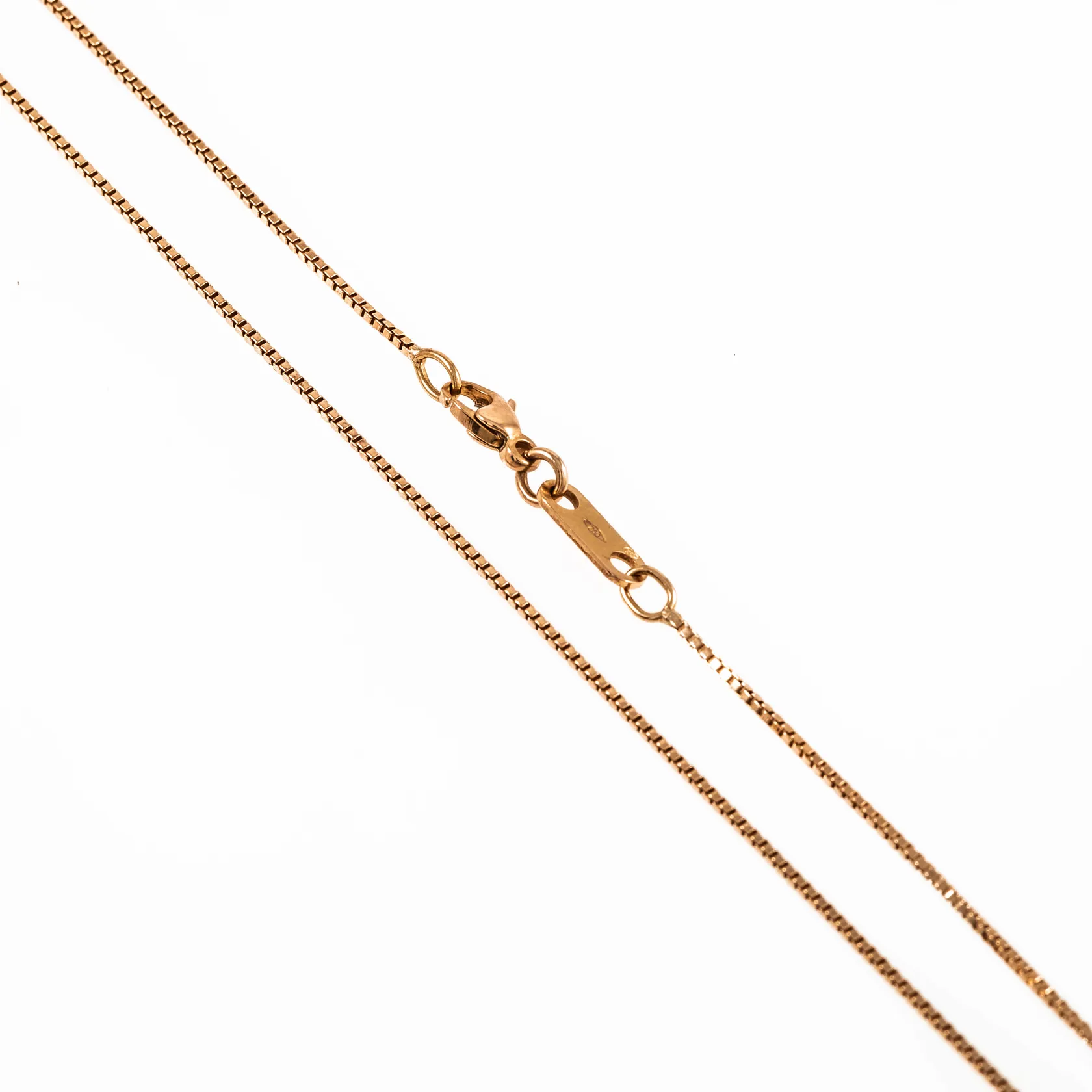 Kedja Venezia i 18K guld. Den är 43 cm lång, 0,9 mm bred och väger 3,9g. Karbinhake. Vikt: 3,9 g.