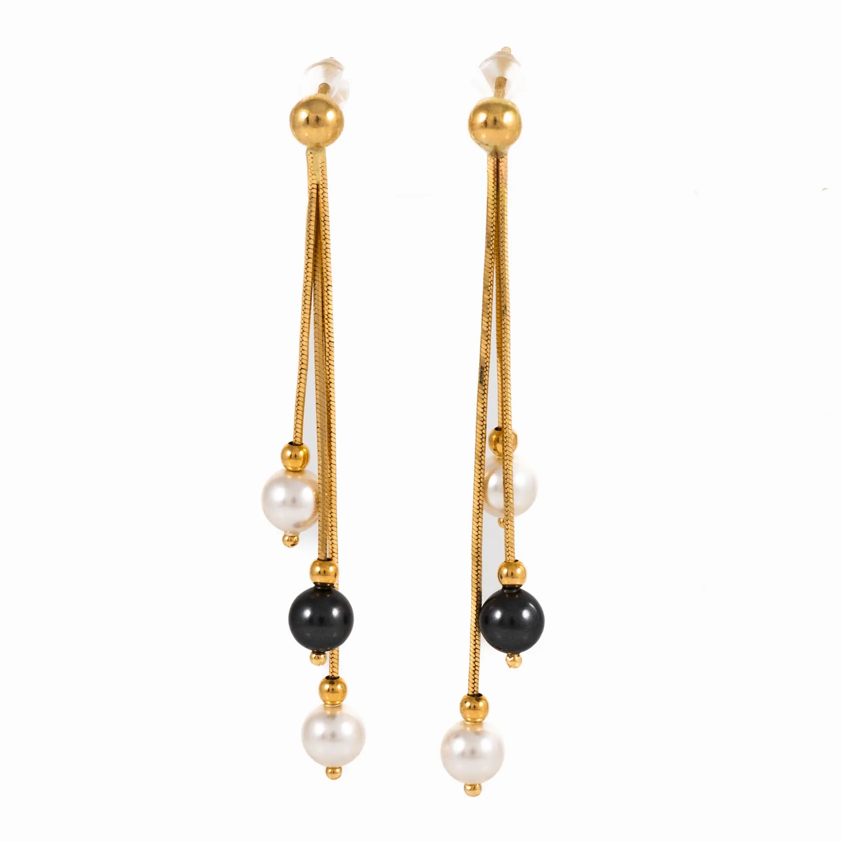 Hängande örhängen i 18K guld med imiterade vita & svarta pärlor Ø 5 mm. De är 4 - 5 mm breda, 55 mm långa och väger 4,0g. Vikt: 4 g.