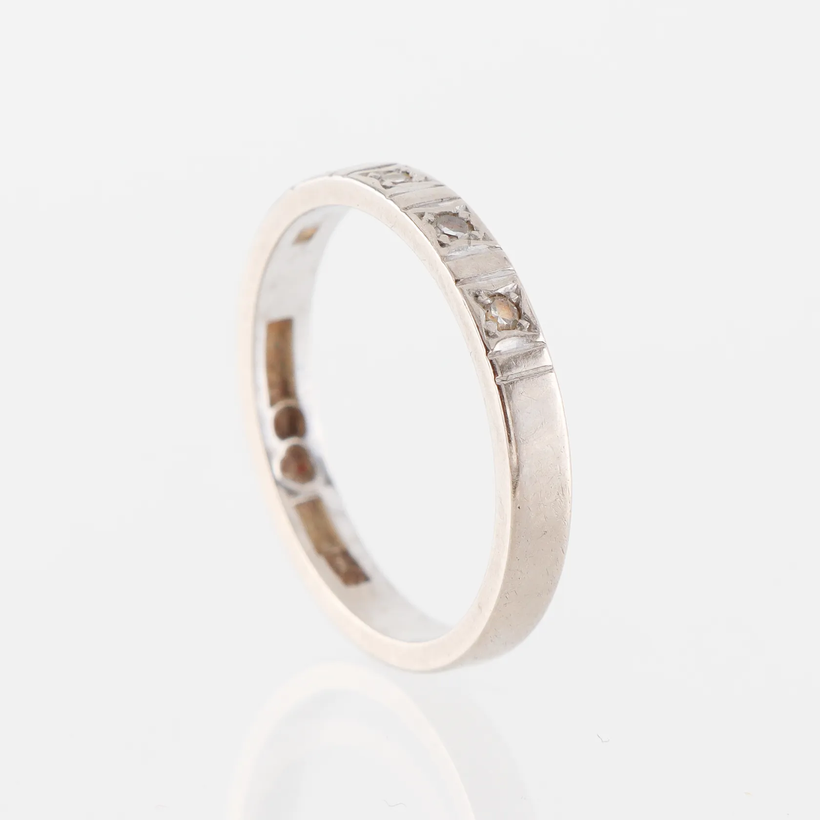 Ring med diamanter ca 5x0,01ct, stl 17mm, bredd 2,7mm, vitguld, 18K. Vikt: 3,1 g.