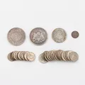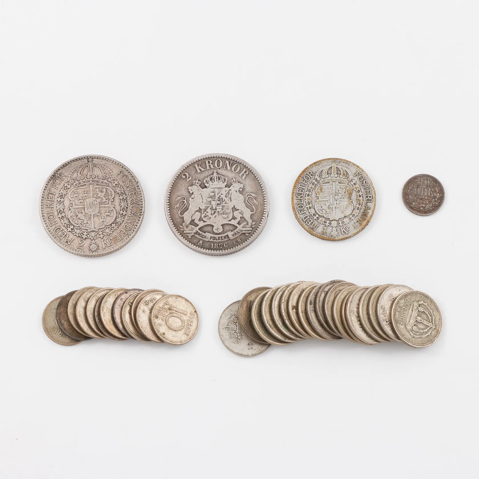 Mynt 2 st 2 kronor 1913 och 1876, 1 krona 1937,25 öringar 18 st,10 öringar 11 st, Vikt: 96,8 g.
