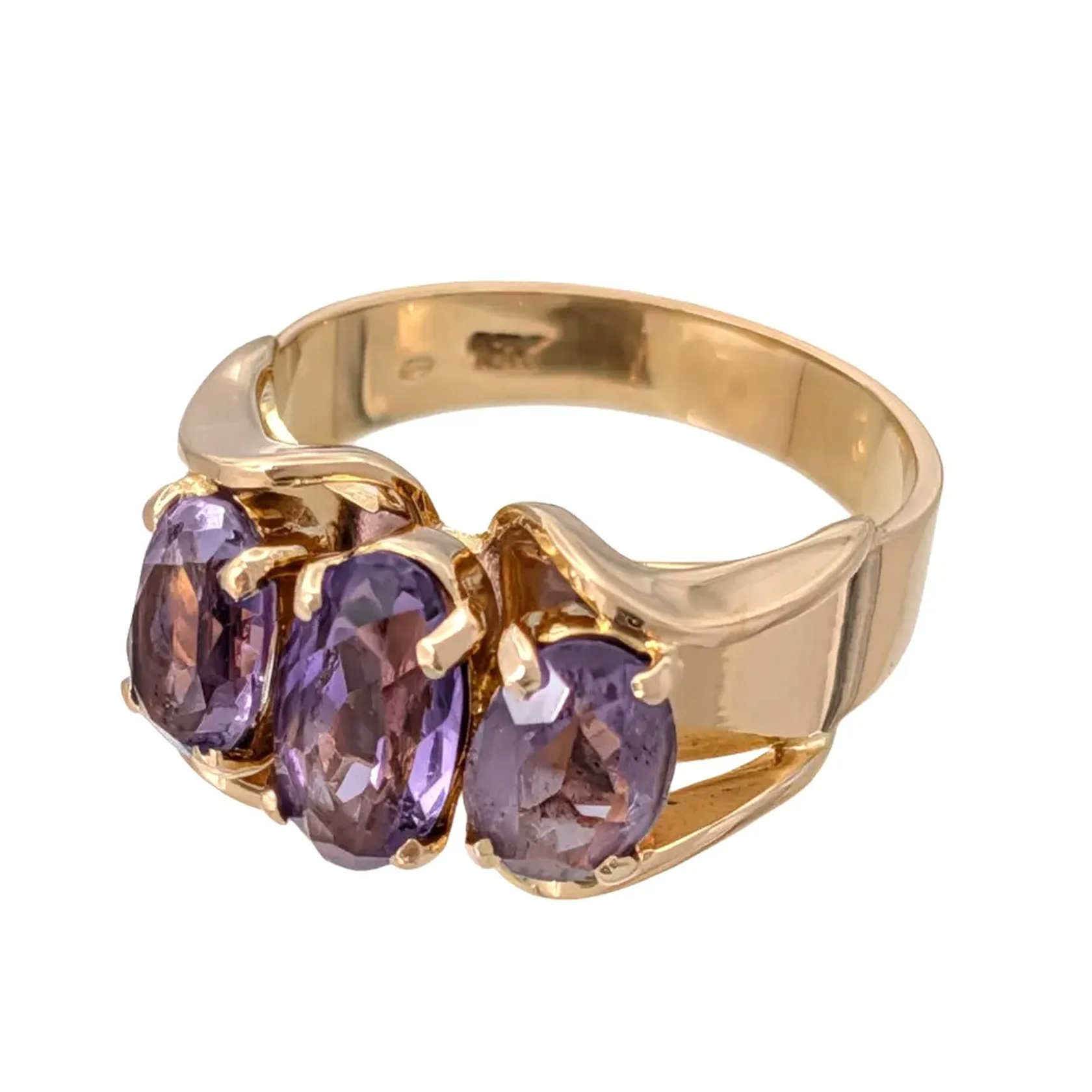 Ring 18K guld Ametister 5 x 7 - 5 x 8,5 mm, svensk kontrollstämpel, Ø17,0 mm, bredd 3,5 - 10 mm, fint skick, stenar utan anmärkning Vikt: 6 g.