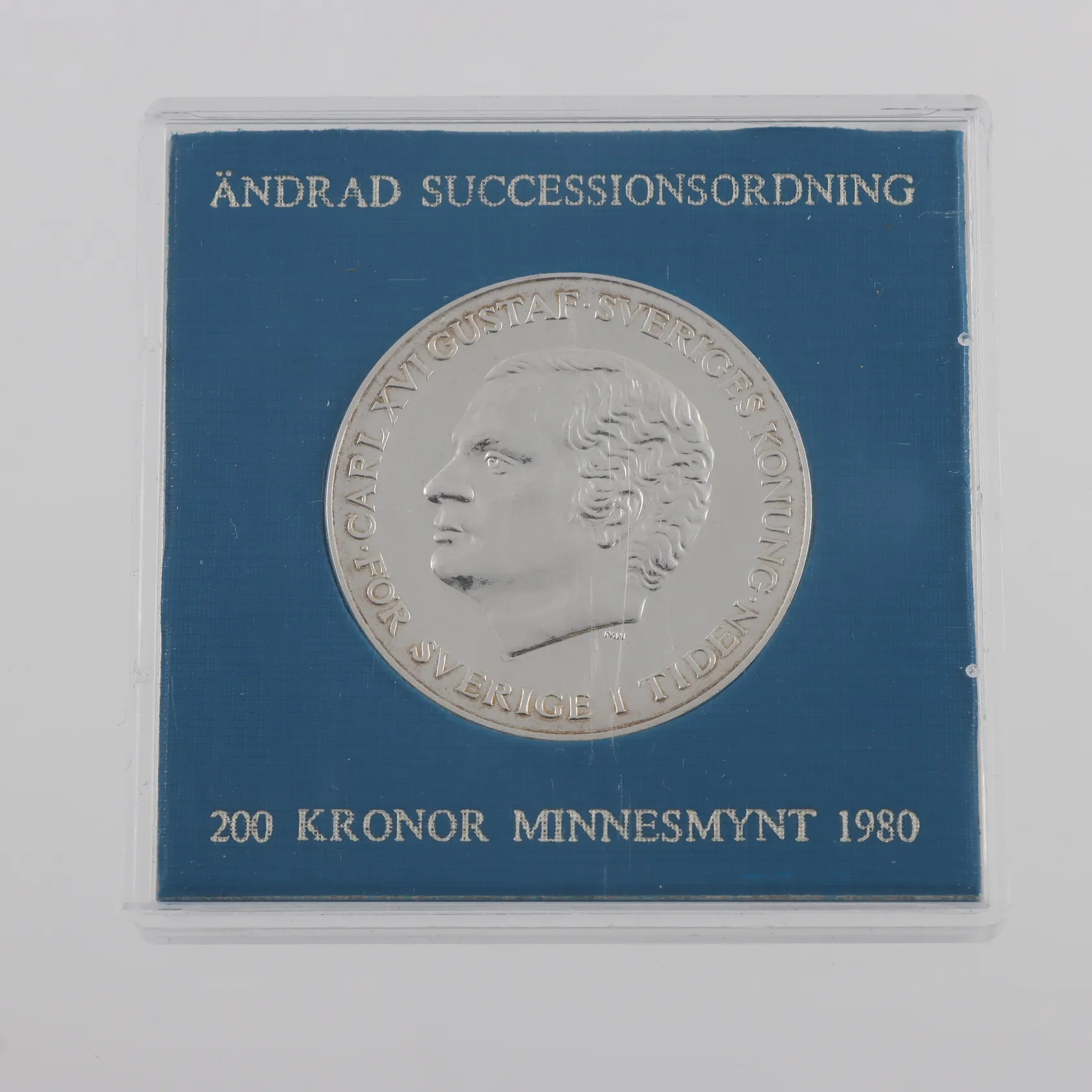 Minnesmynt, Ø34mm, Sveriges Konung Carl XVI Gustaf, För Sverige i tiden, ändrad successionsordning, år 1980, 200kr, plastetui, 925/1000 Vikt: 27 g.