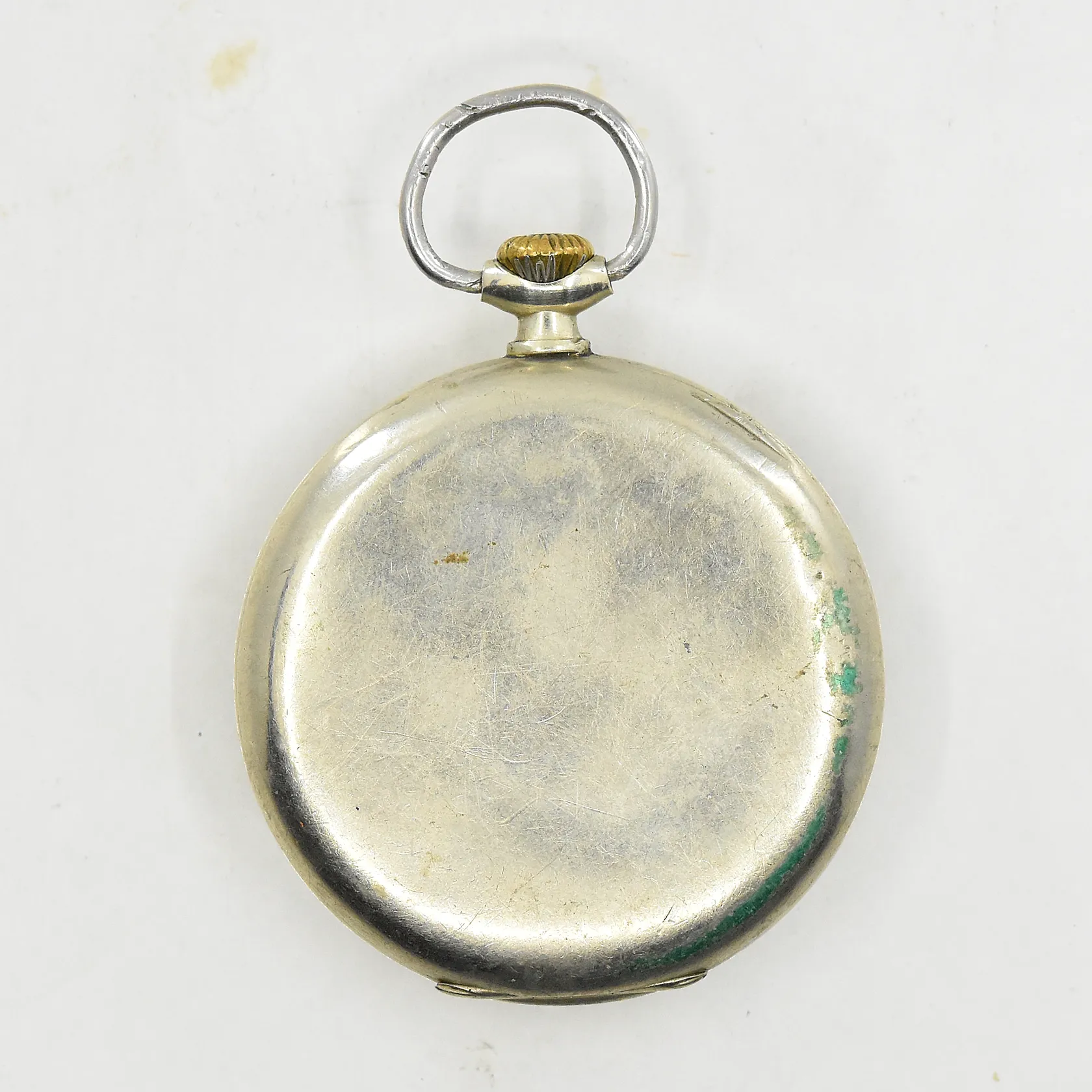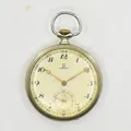 Fickur Omega, boett Ø48 mm, manuell, stål, boettnr 9487957, serienr 8706415, defekt krona/går ej att dra upp, krackeleringar på urtavla, klockkedja i metall, inga tillbehör.