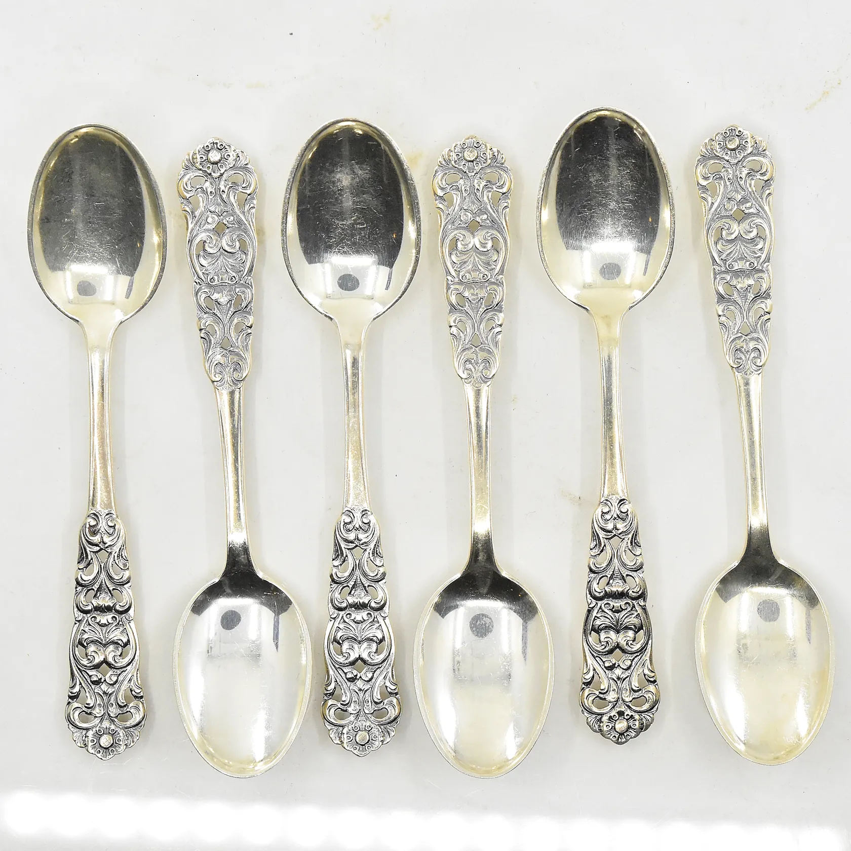 6 teskedar, längd 10 cm, ca 1940-tal, 830/1000 silver. Vikt: 51,1 g.