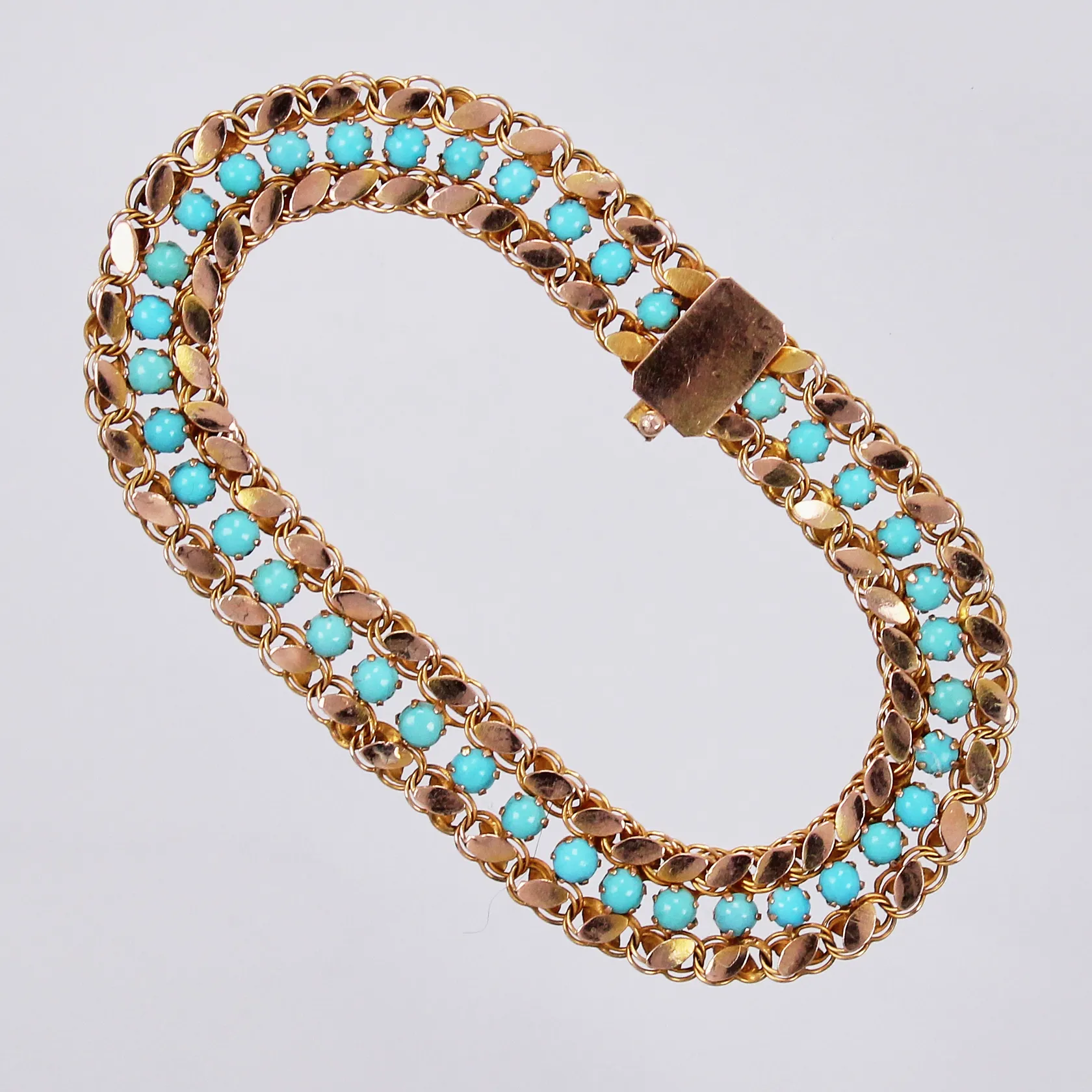 Armband med små turkoser längd: ca 18,5cm bredd: ca 10mm buckliga/defekta länkar 14K Vikt: 10 g.