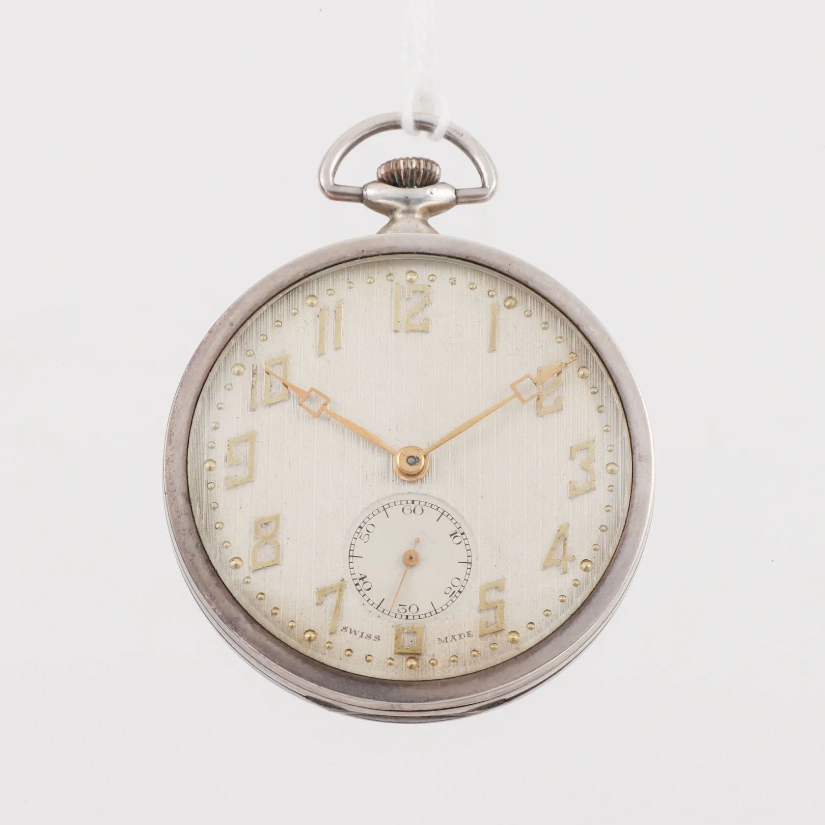 Fickur, tickar igång men ej funktionstestat, diameter ca 5 cm, graverad innerboett, silver även innerboett.