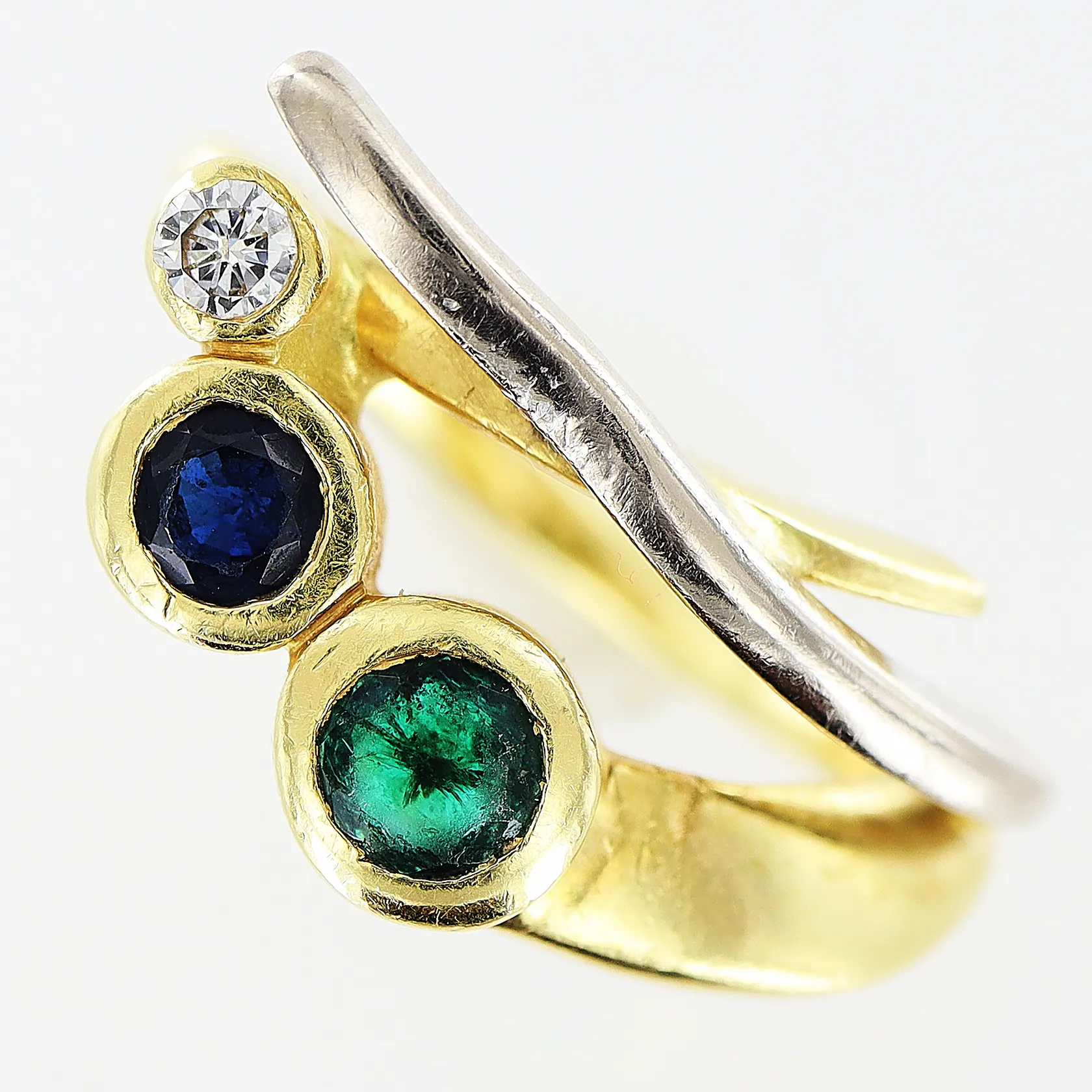 Ring diamant 0,05ct samt blå och grön sten, stl 16¾, bredd 2-11mm, vit/gulguld, slitage på stenar och infattning, 18K Vikt: 10,9 g.