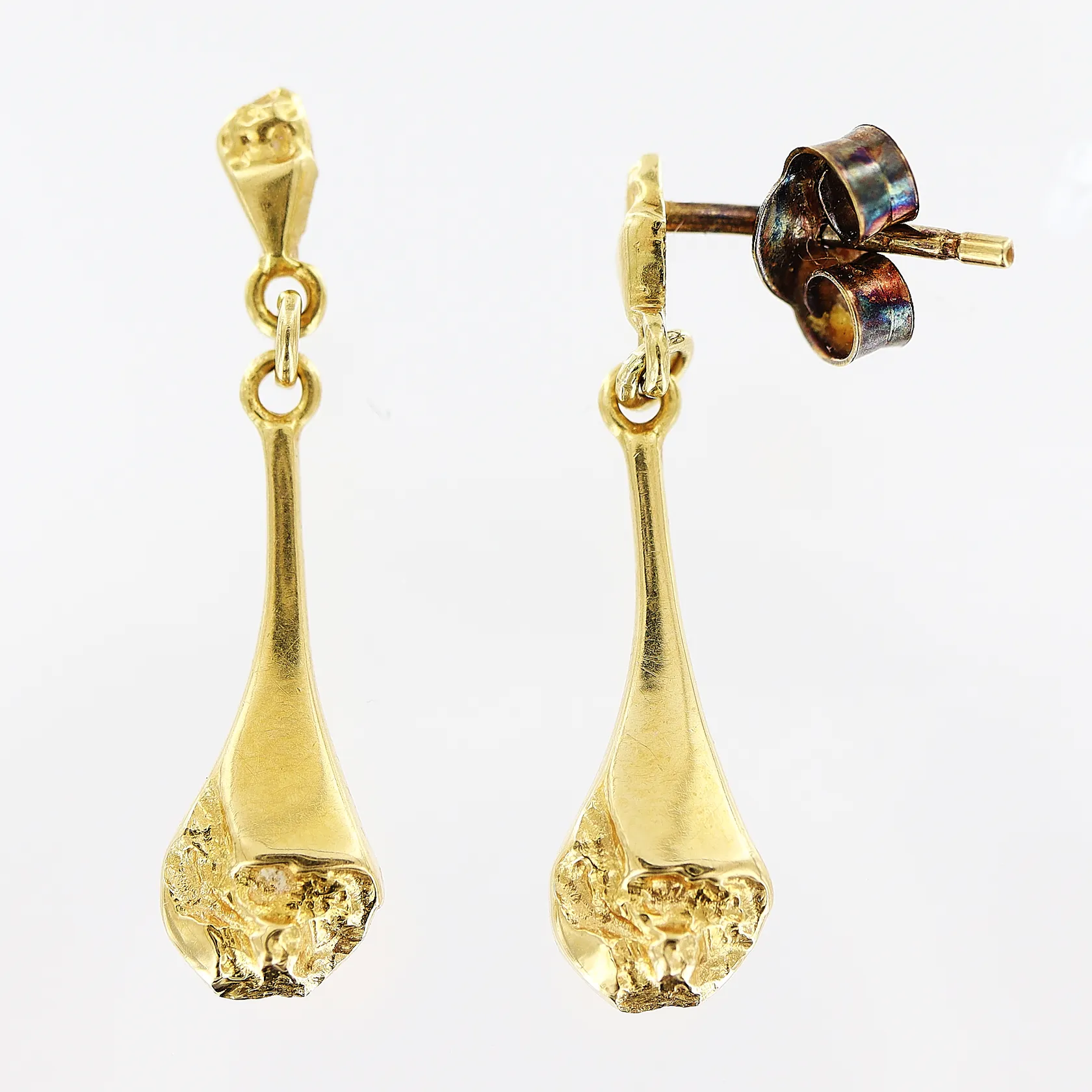 Ett par örhängen, 22mm, en pigg skev, en stopp i gummi, 18K Vikt: 1 g.