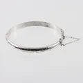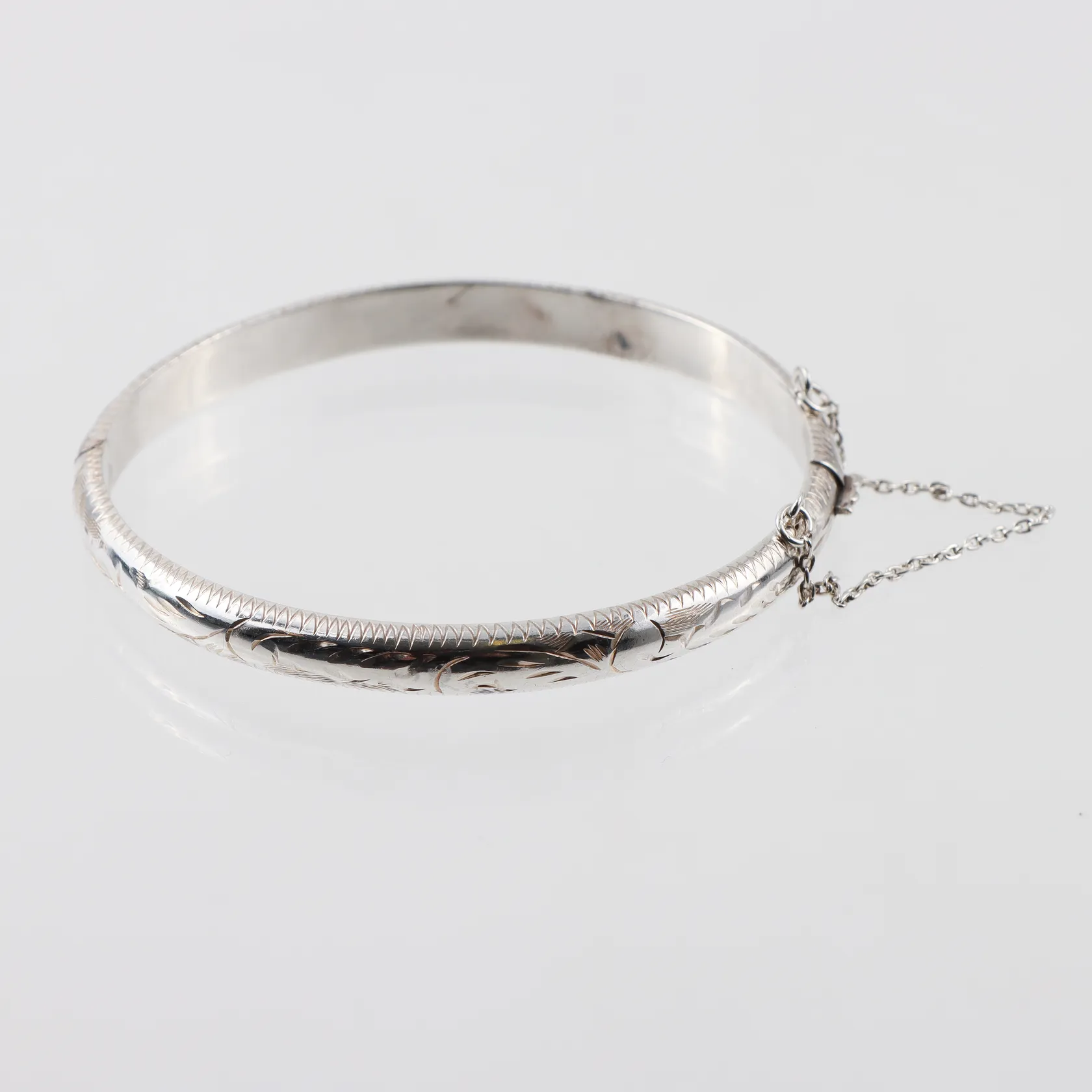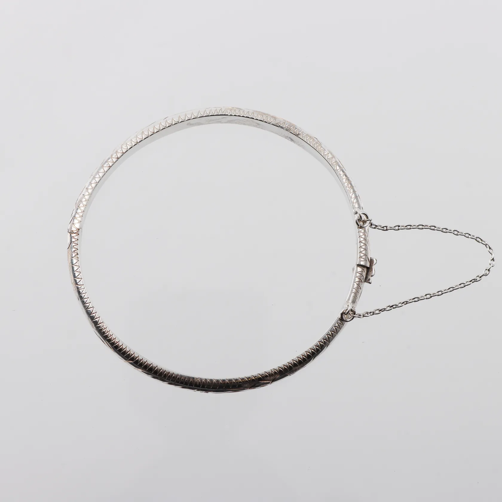 Armring mönstrad, öppningsbar med säkerhetskedja, Ø ca 5,5cm, nästan runf, bredd 6,1mm, silver Vikt: 9,3 g.