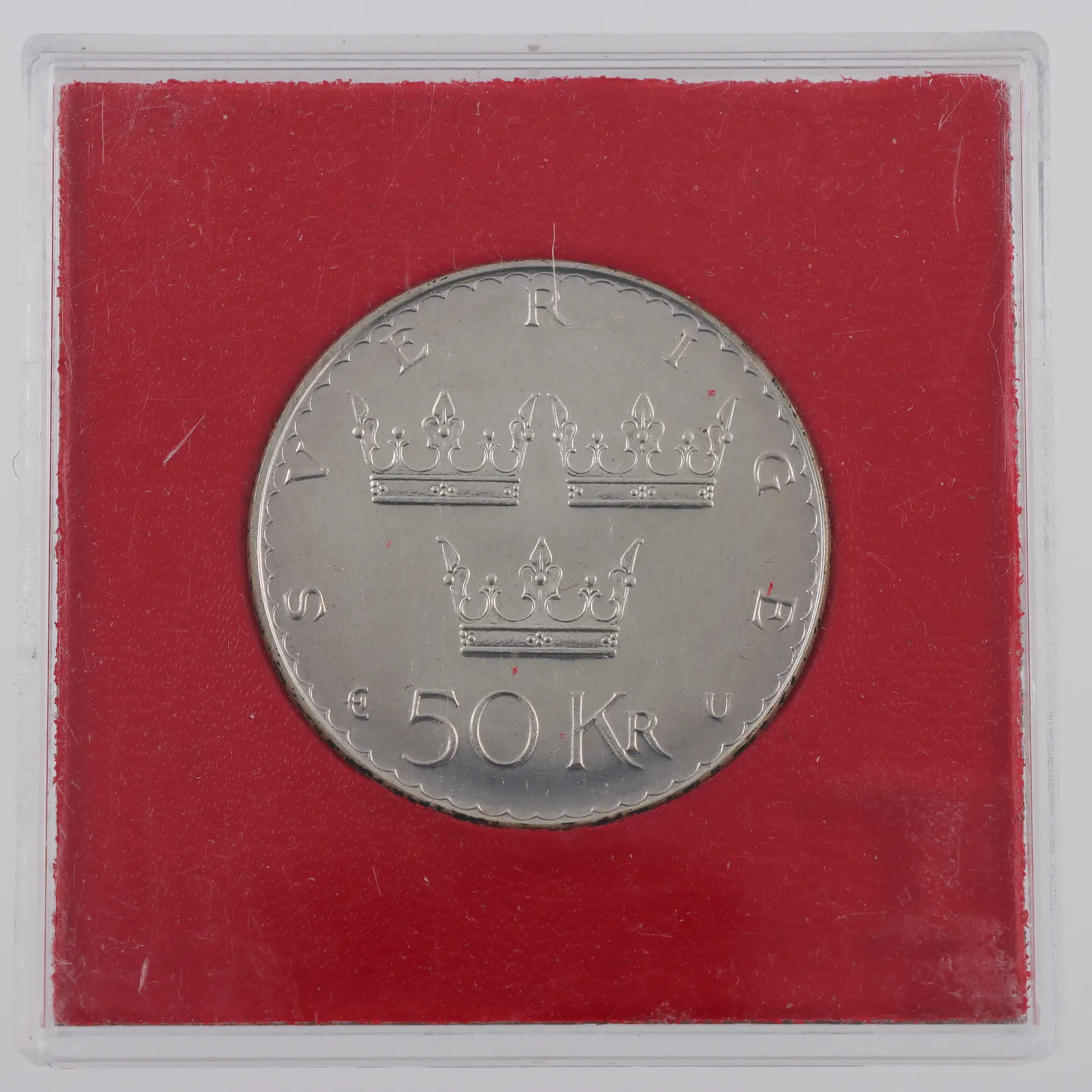 Minnesmynt 50kr, Ø36mm, I Sverige utgår från folket all offentlig makt, år 1975, plastetui, 925/1000 Vikt: 27 g.