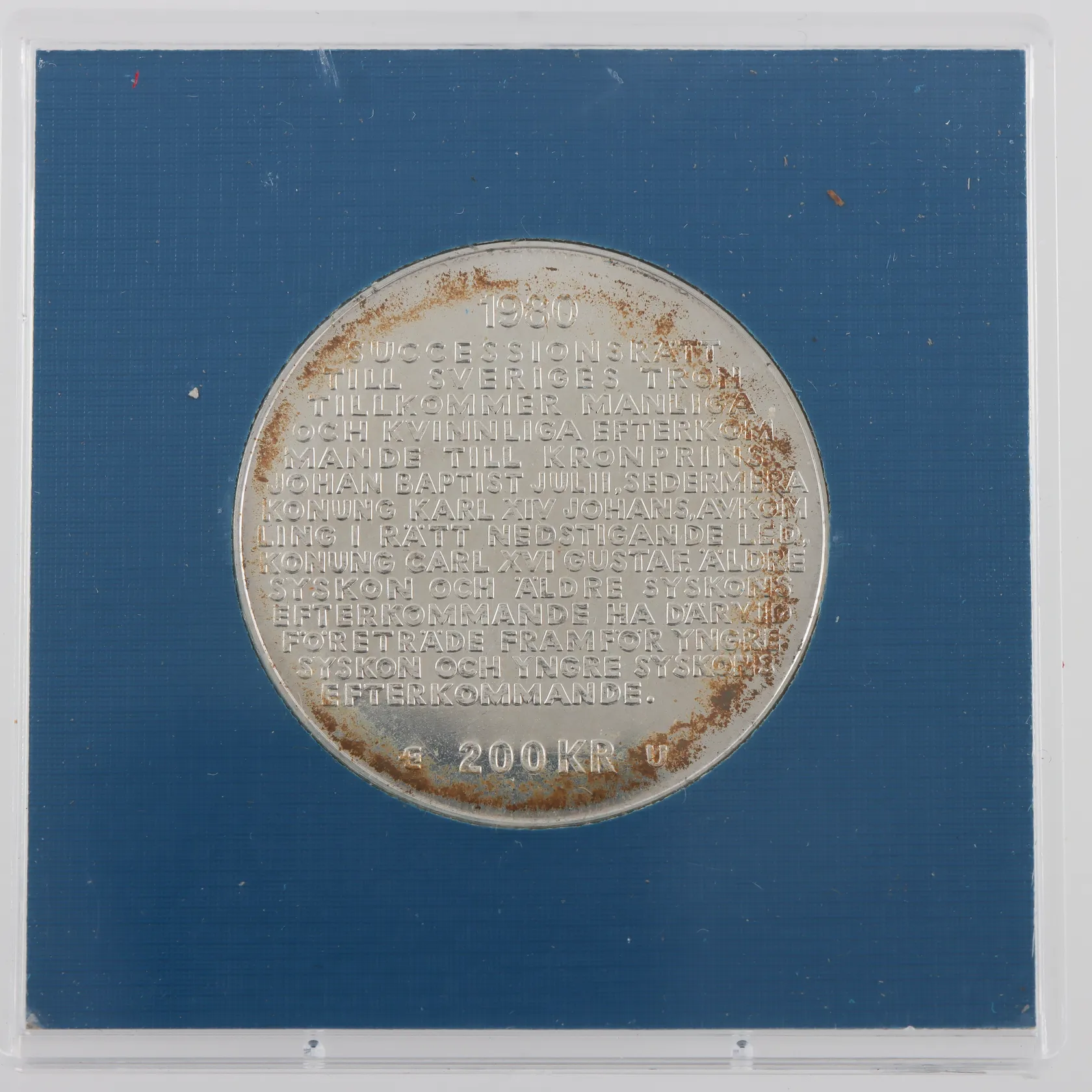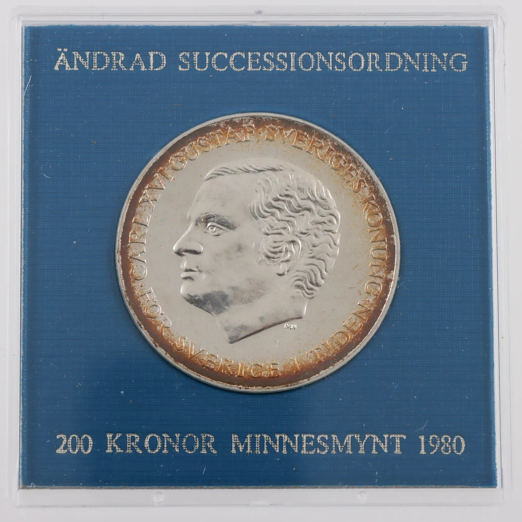 Minnesmynt, Ø34mm, Sveriges Konung Carl XVI Gustaf, För Sverige i tiden, ändrad successionsordning, år 1980, 200kr, plastetui, 925/1000 Vikt: 27 g.