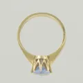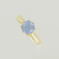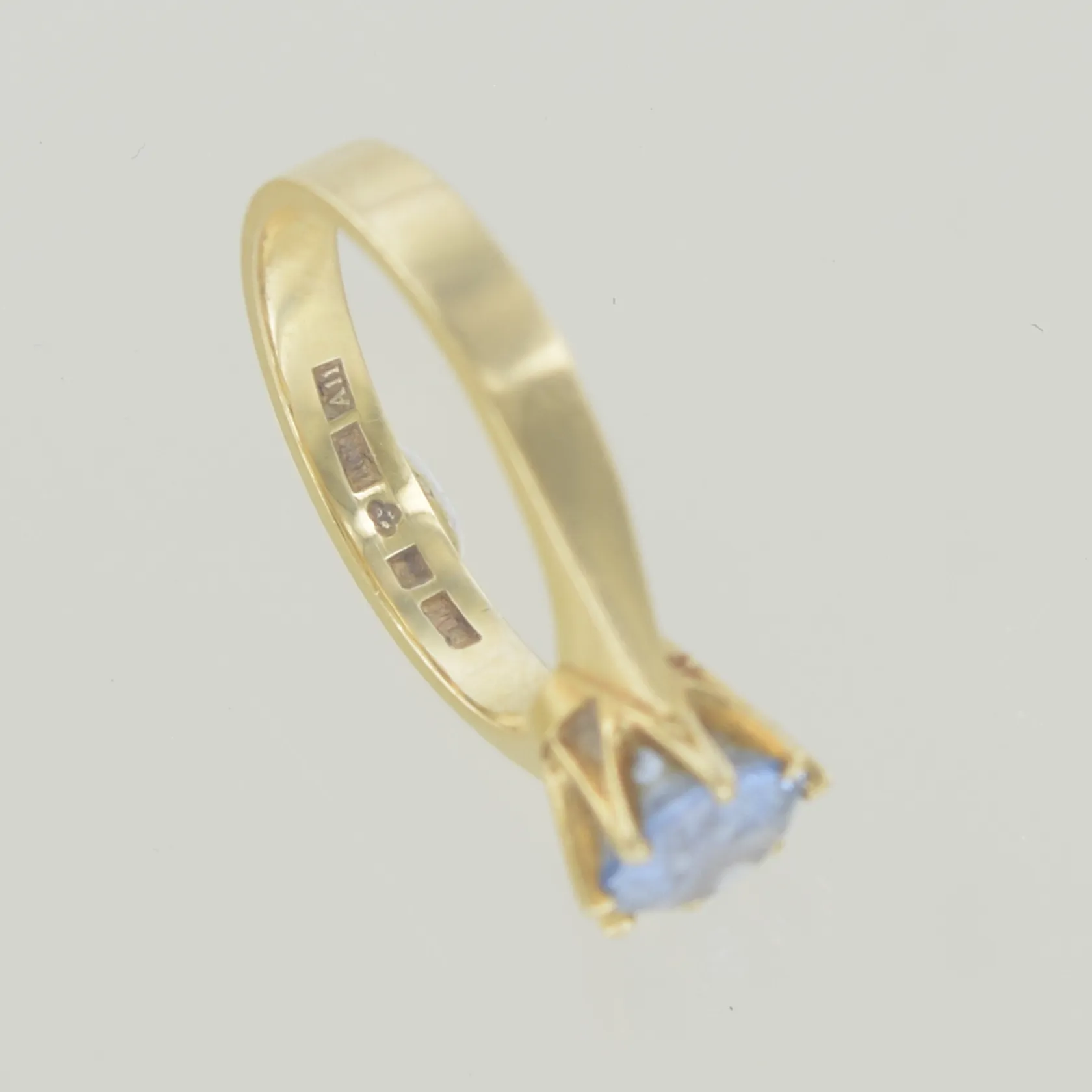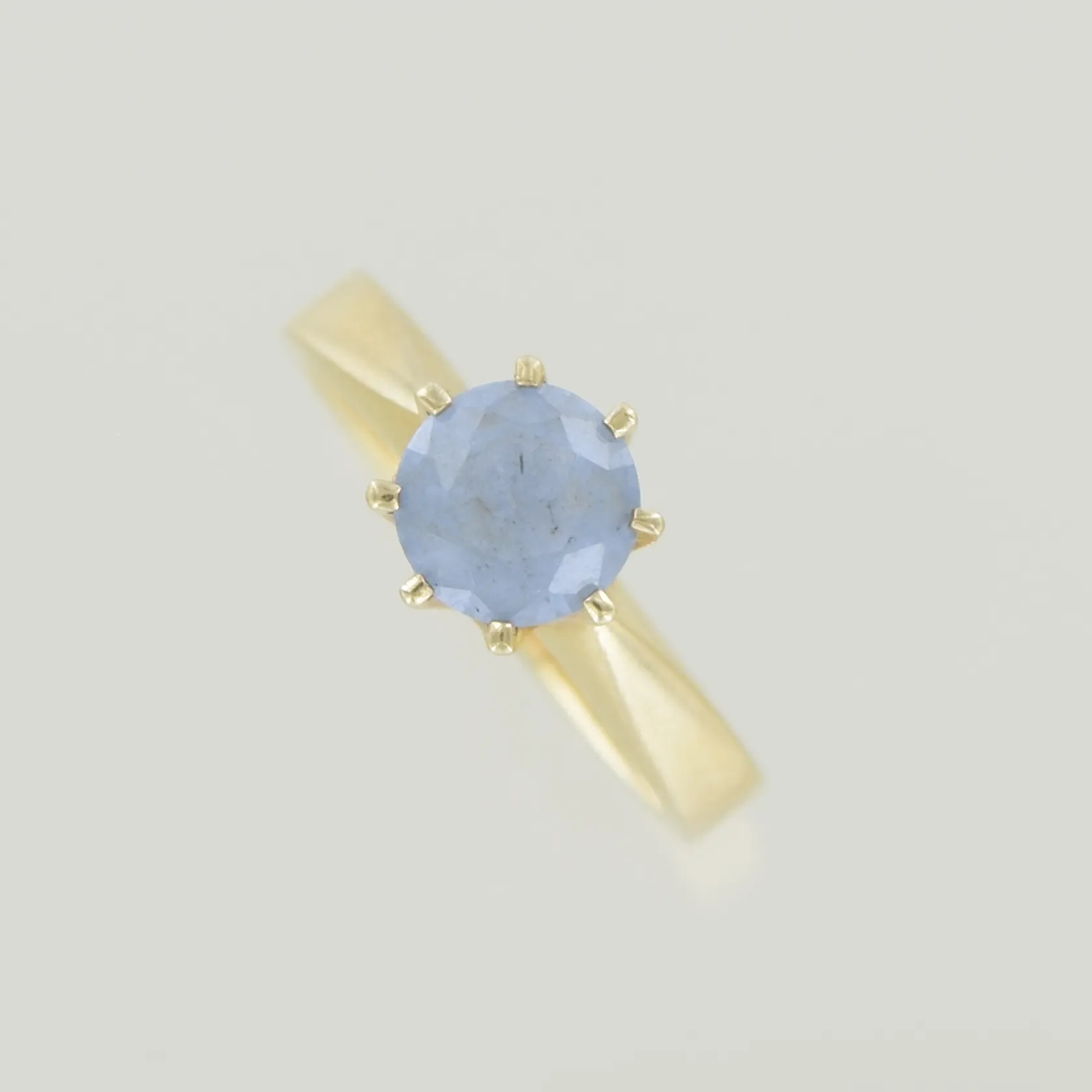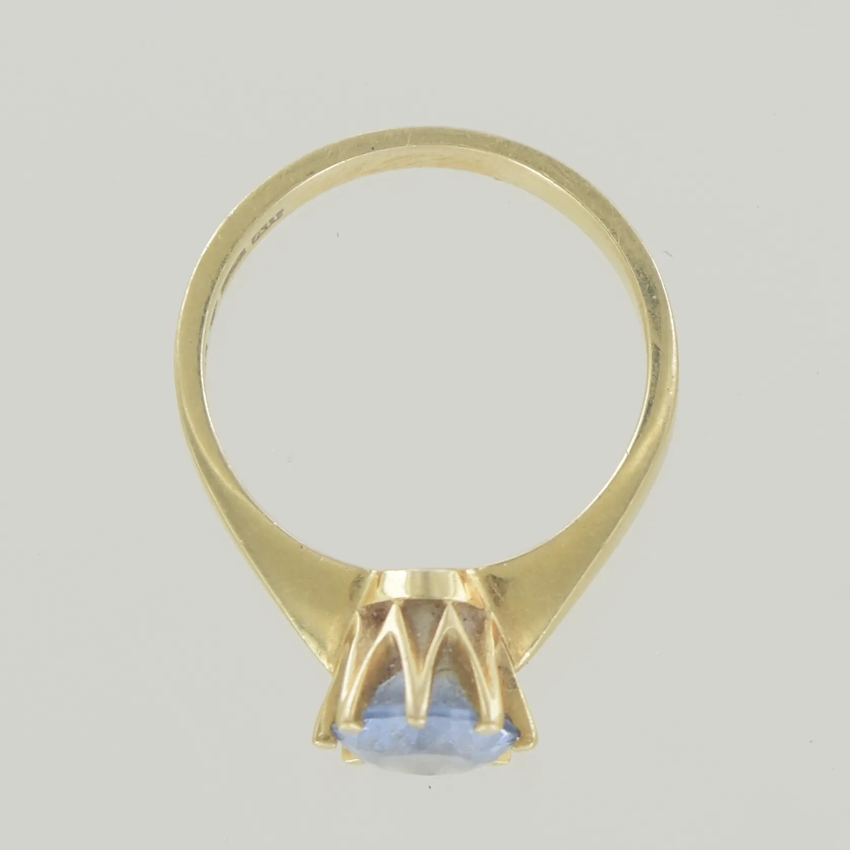 Ring med ljusblå sten, Ø 17 mm, bredd 7 mm, graverad, 18K Vikt: 4,3 g.