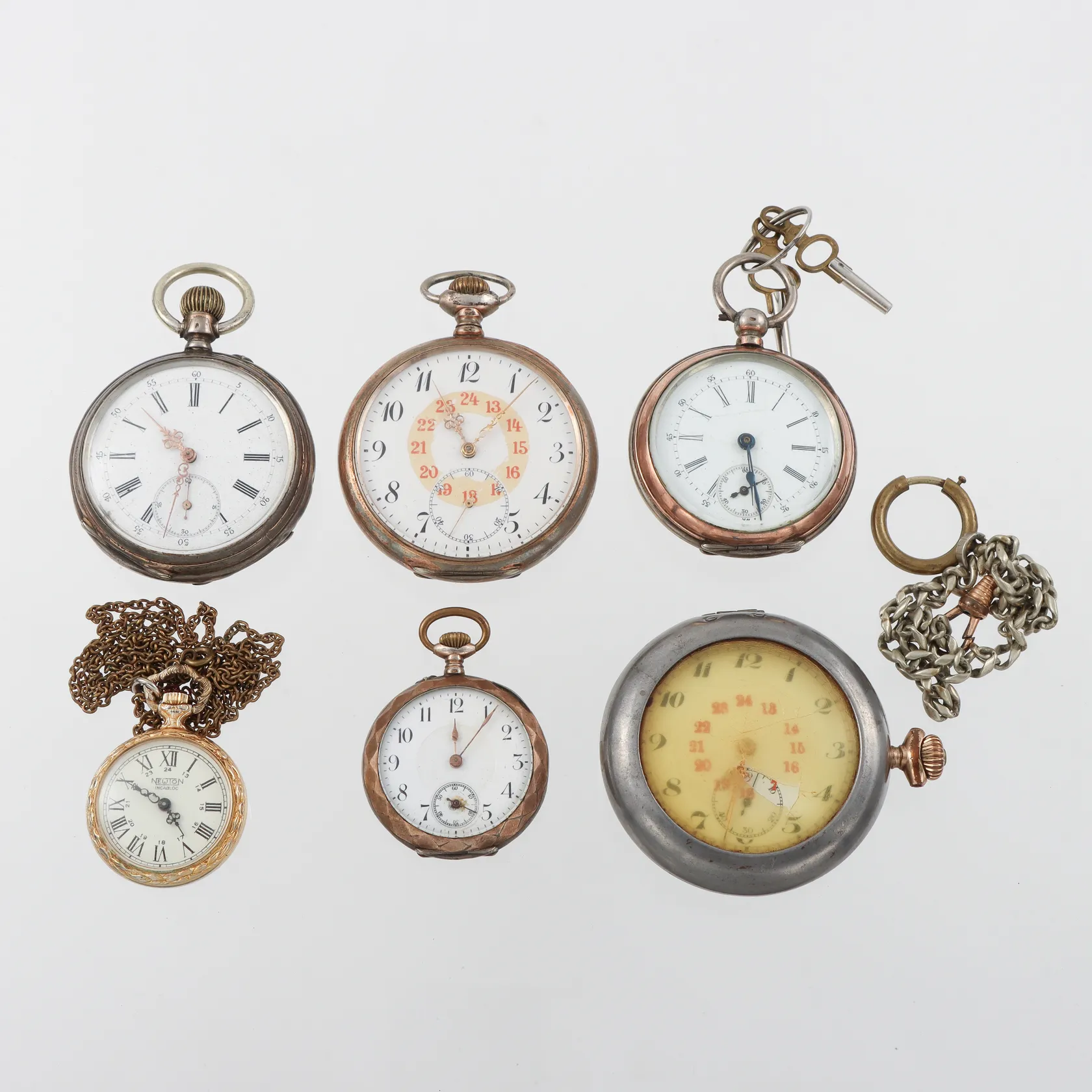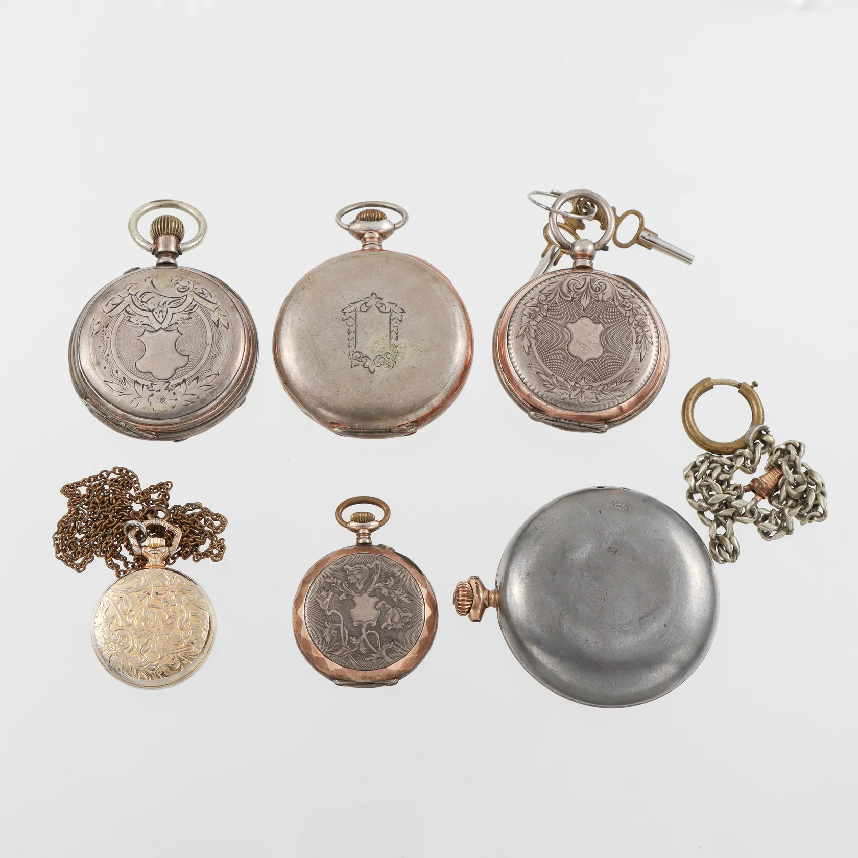 Fickur 6 st varav 4 st silver, dom fungerar ej och har skador/slitage, klockkedja metall.