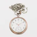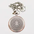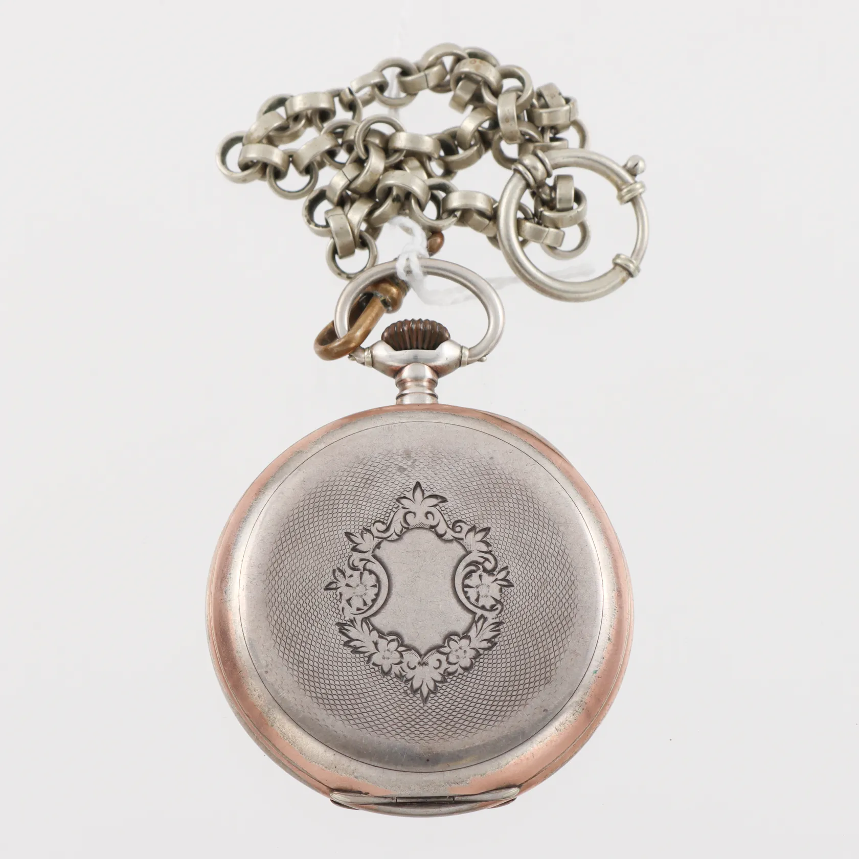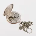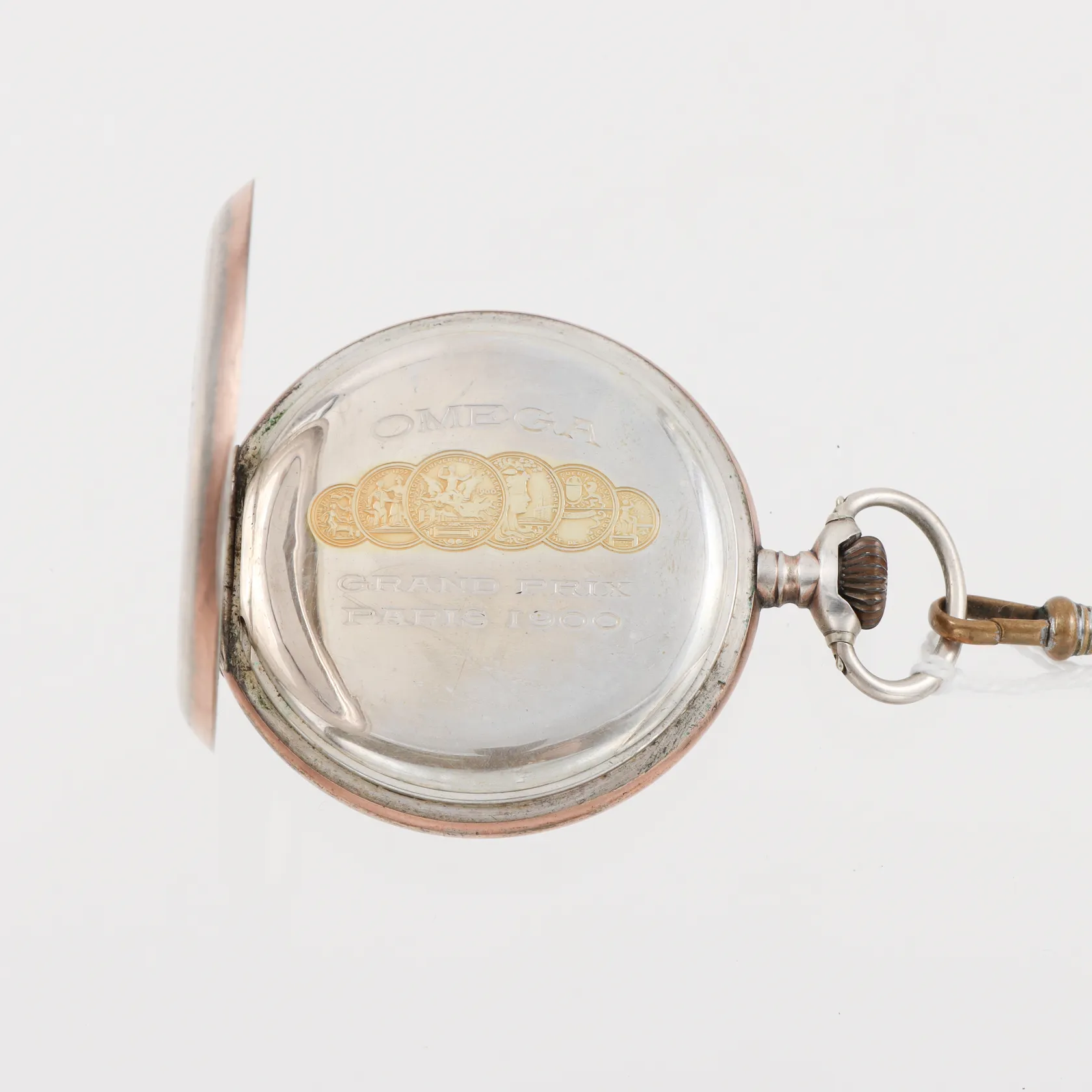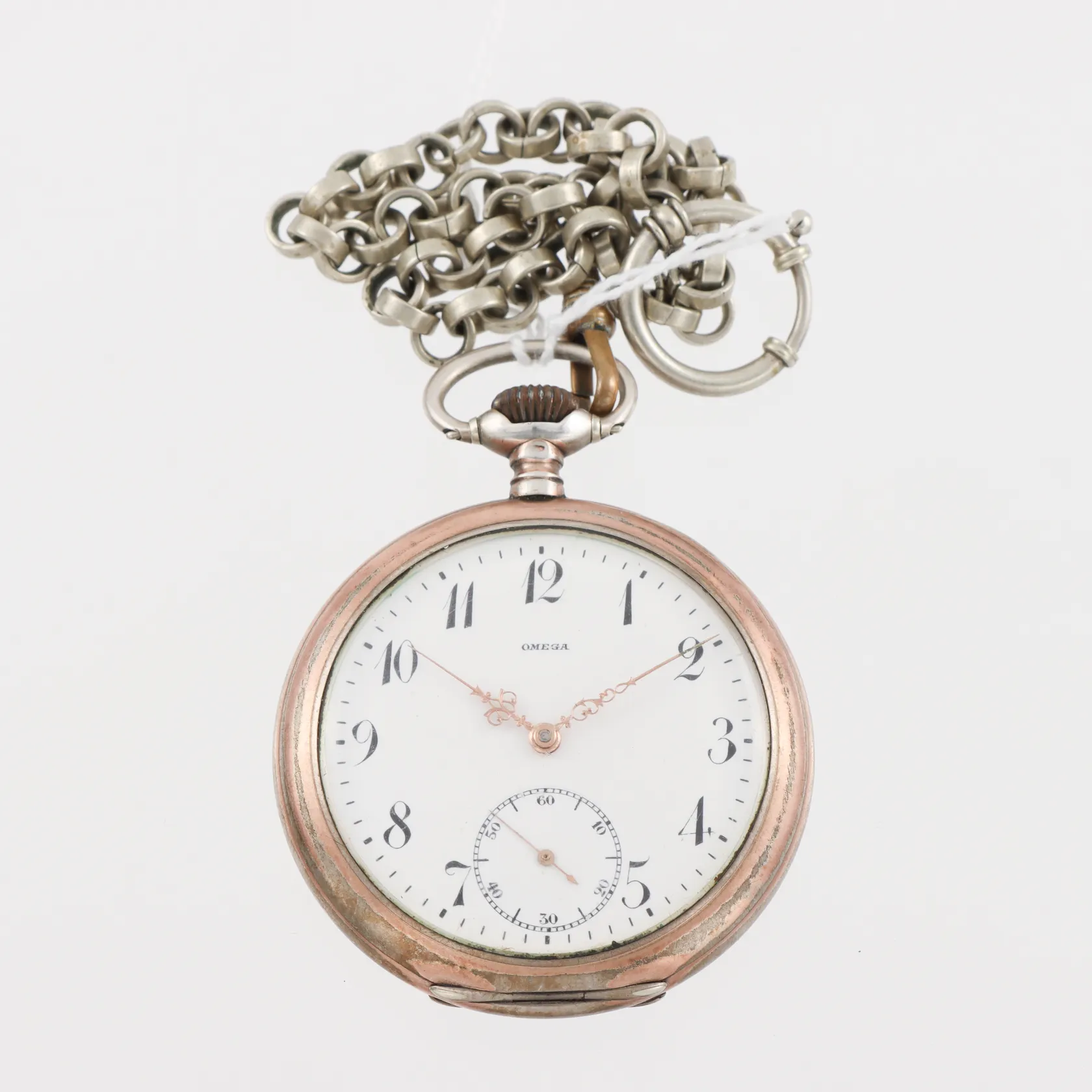 Fickur Omega, tickar igång men ej funktionstestat, diameter ca 5 cm,silver,klockkedja vitmetall,någon ojämnhet.