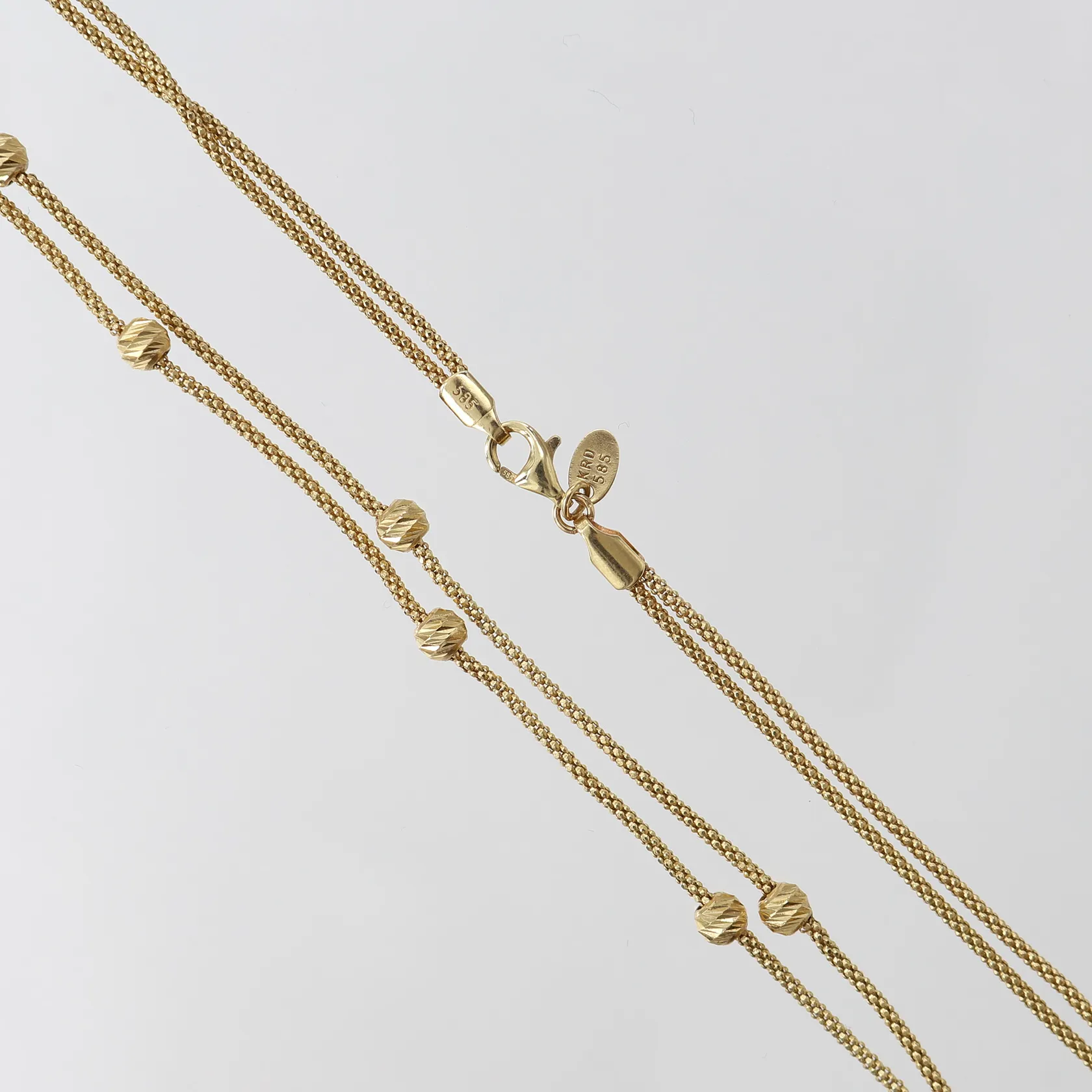 Collier med integrerade kulor, tvåradigt, längd 44,5cm, bredd 1,3-4mm, 14K. Vikt: 7 g.