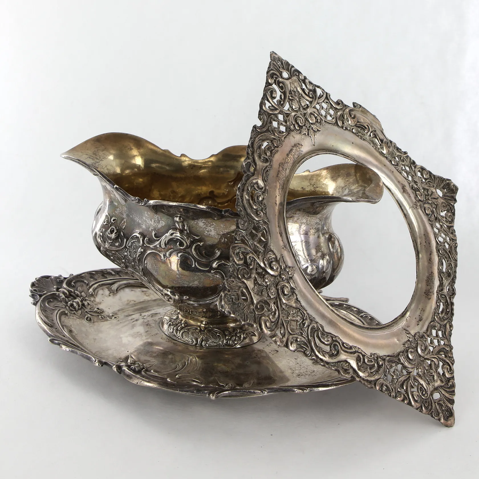 Såsskål 17,5, 22,5x9cm, silver 800/1000, del av ram 15x16cm ostämplat silver Vikt: 450,7 g.