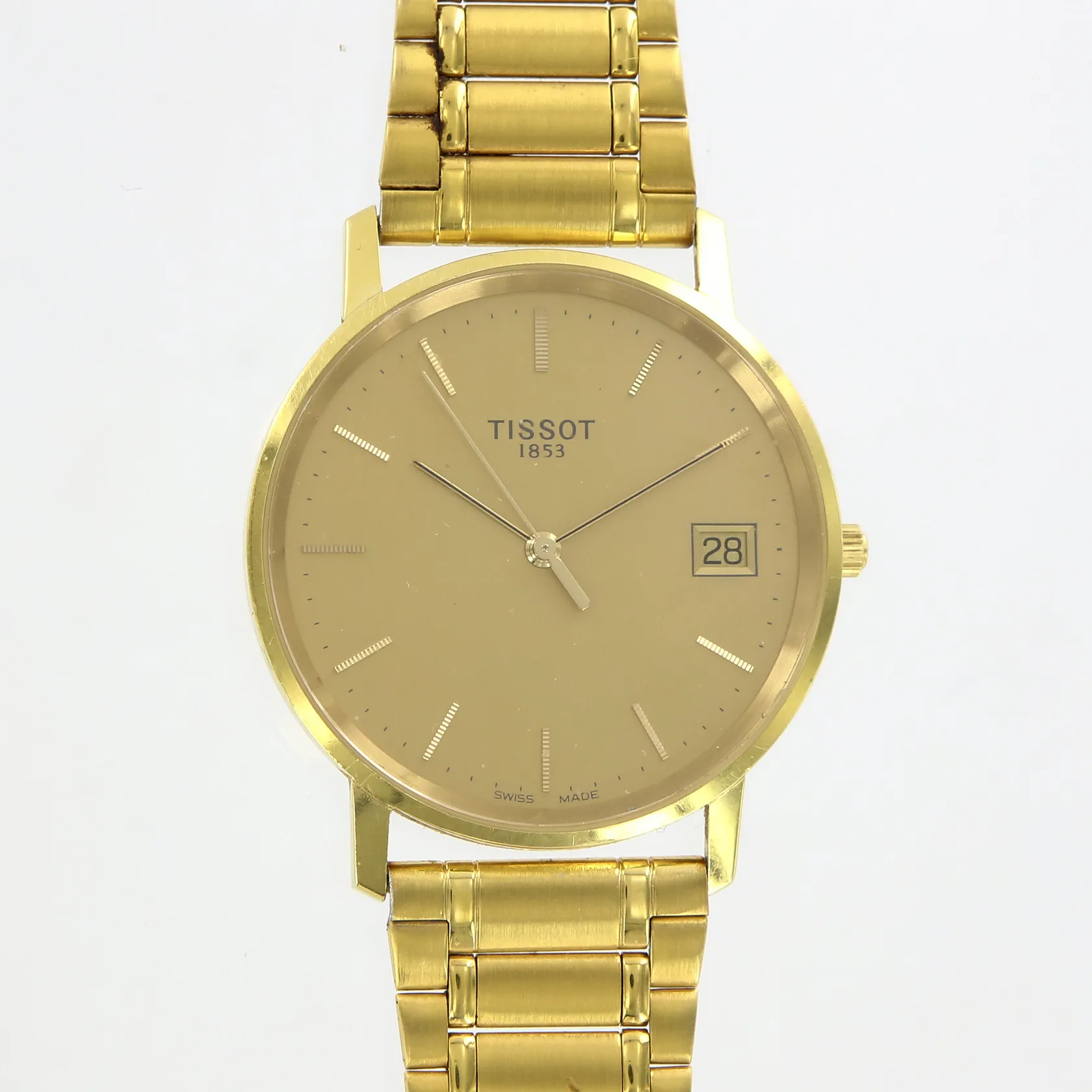 Herrur Tissot Ø34mm, quartz, datumfönster, länk i gulmetall, batteribyte krävs, boett i 18K