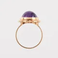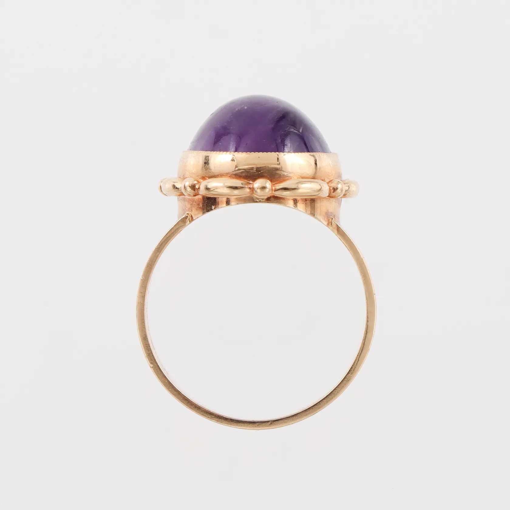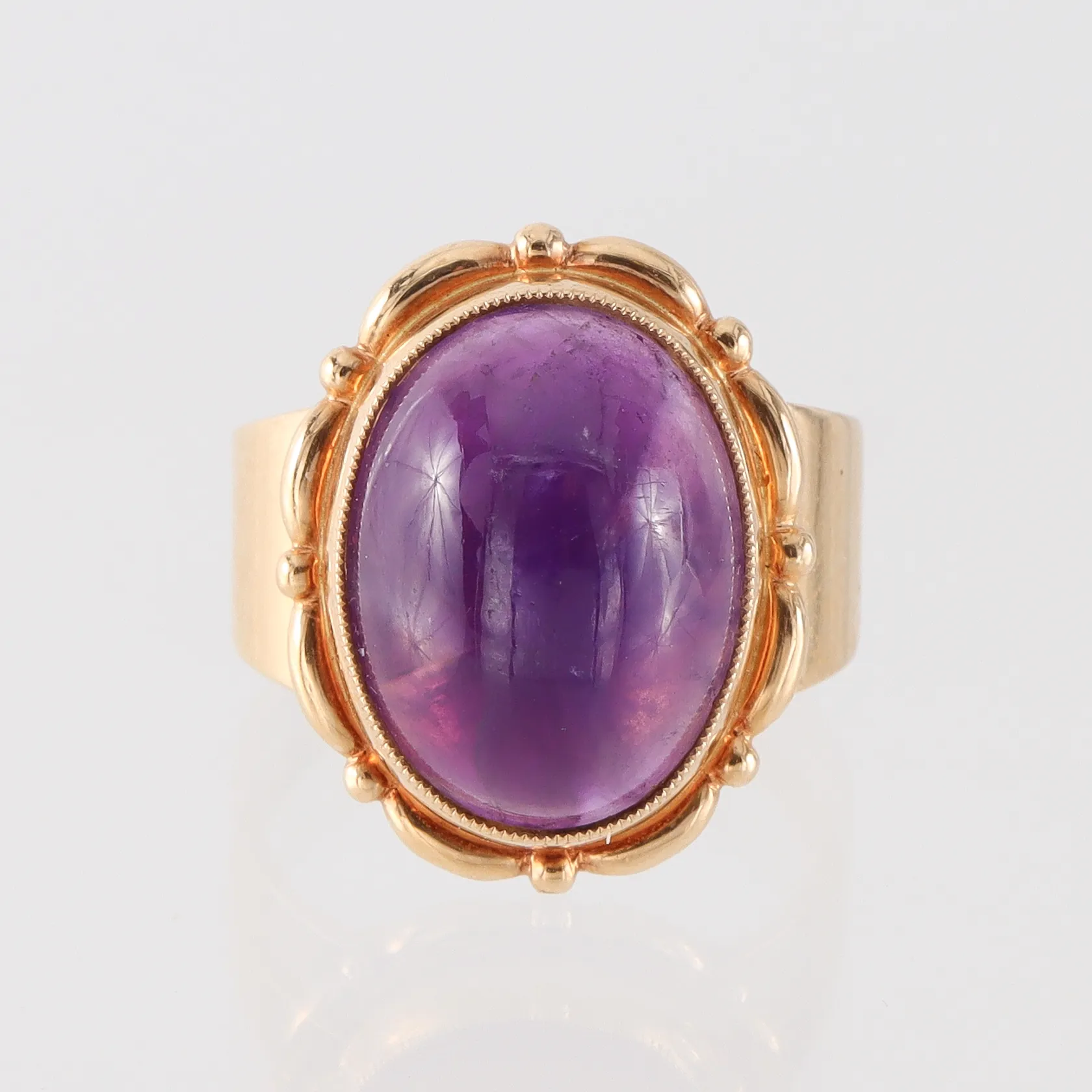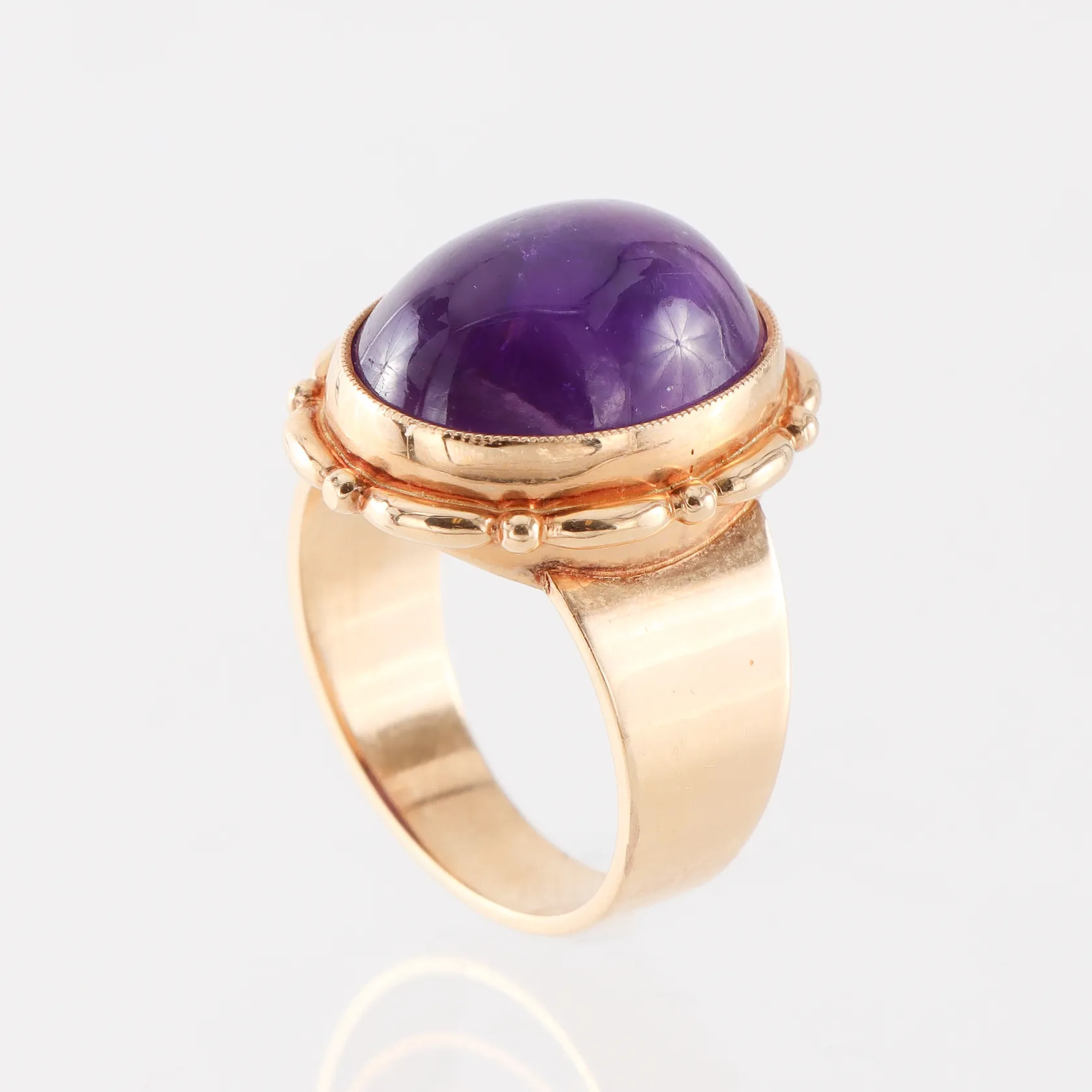 Ring med cabochonslipad lila sten troligtvis ametist, Håkanssons guld Karlstad, storlek 17 mm, bredd 4.4-19.2 mm, 18k. Vikt: 8,7 g.