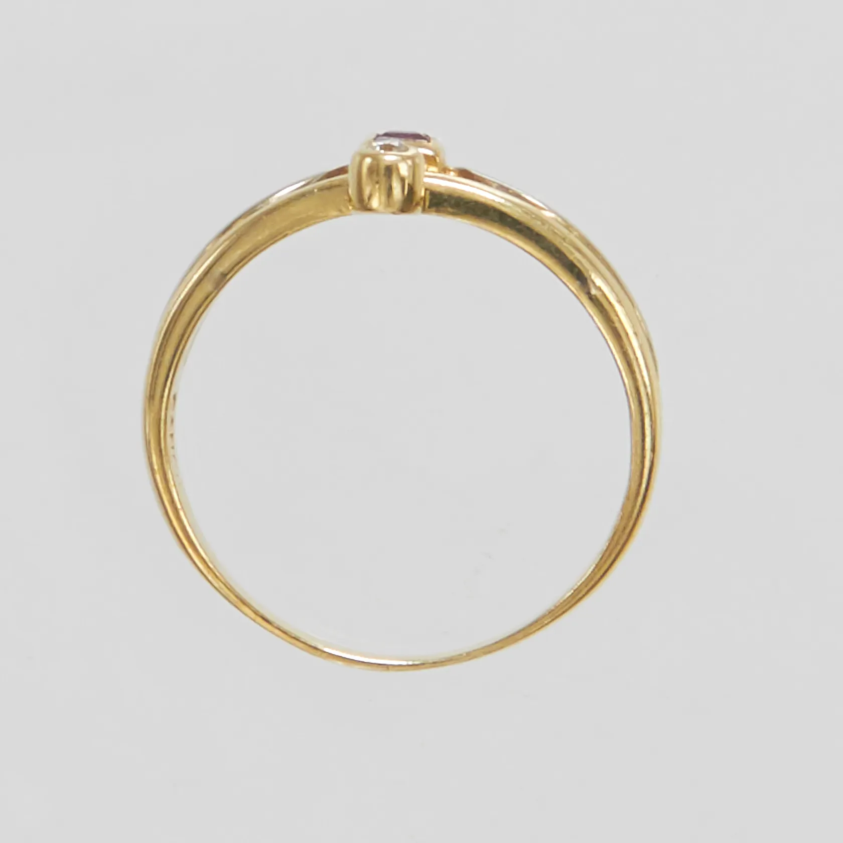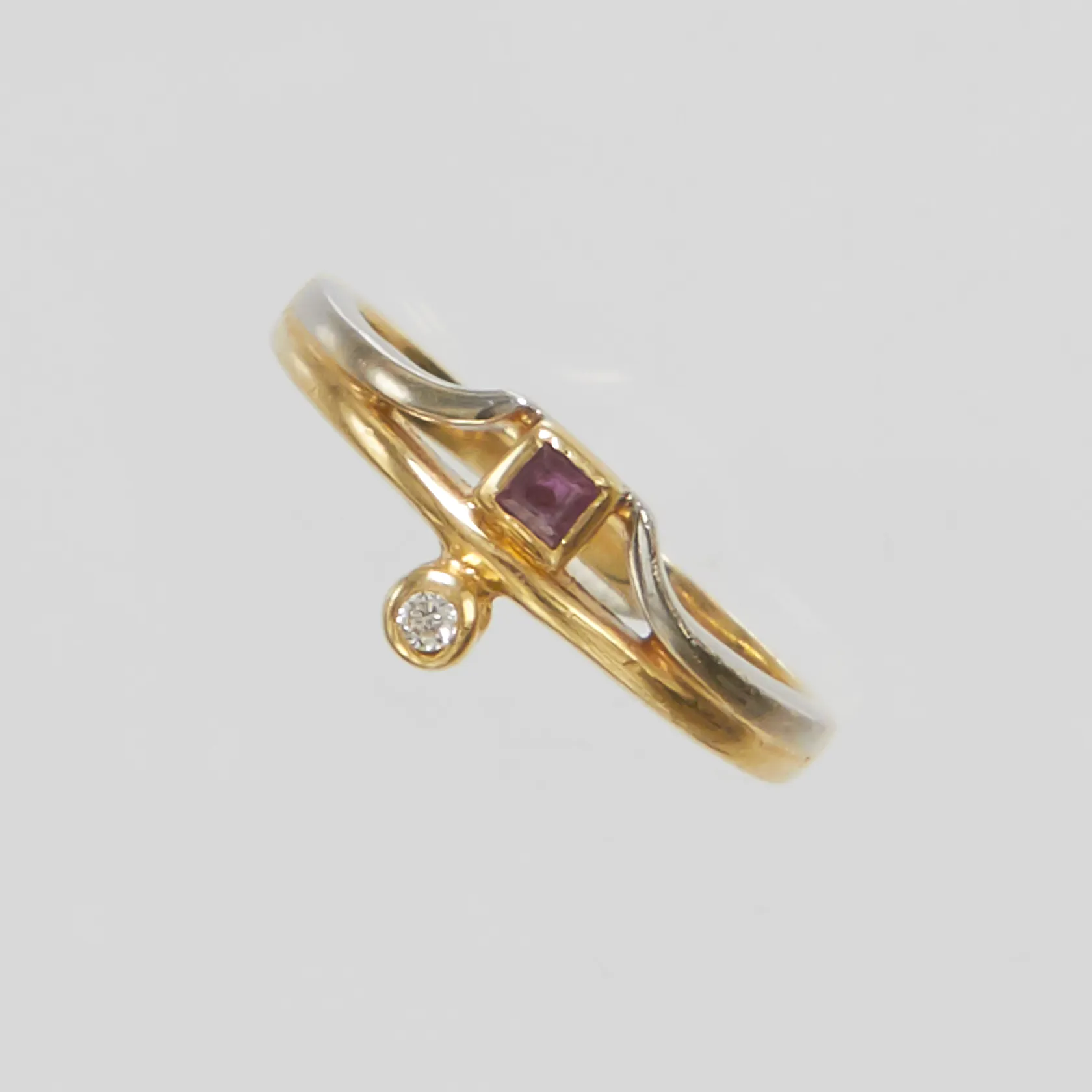 Ring med rubin samt diamant 1 x ca 0,02ct, stl17¾, bredd 1,5-8mm, tvåfärgad, 14K Vikt: 2,5 g.